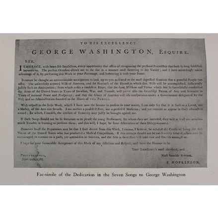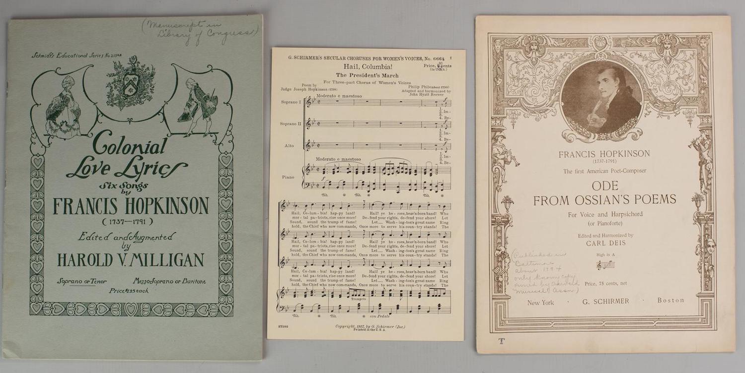 Printed music includes "Ode From Ossian's Poems for Voice and Harpsichord or Pianoforte" (G. Schirmer, New York 1920), 12pp.; "Hail, Columbia! The President's March" by Hopkinson's son, Joseph Hopkinson (1770–1842) (G. Schirmer, New York 1917), 4 pp.; and "Colonial Love Lyrics, Six Songs by Francis Hopkinson, edited and augmented by Harold V. Milligan" (Schmidt, 1919), 30 pp. Also included are photostats of Joseph Hopkinson's "Hail Columbia!: The President's March"