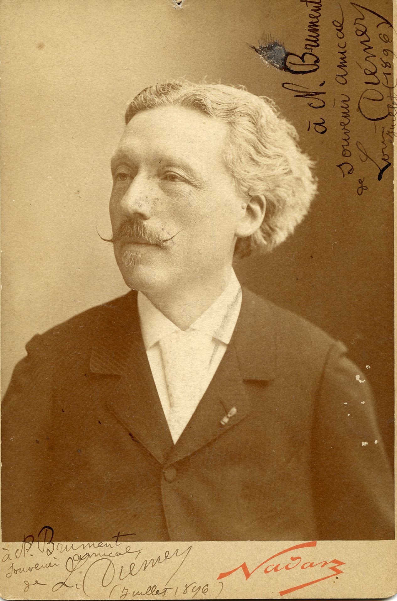 Diémer, Louis-Joseph. (1843-1919) [Gaspard-Félix Tournachon, "Nadar". (1820-1910)]. Signed Nadar Photograph to Narcisse Brument. Signed Nadar cabinet portrait of the French pianist and composer, inscribed twice in ink to the conductor Narcisse Brument: "à N. Brument, souvenir amical de Louis Diémer, juillet (1896)." Single pin hole to upper edge, a few small surface blemishes, overall fine. 4.25 x 6.5 inches (11 x 16.5 cm).