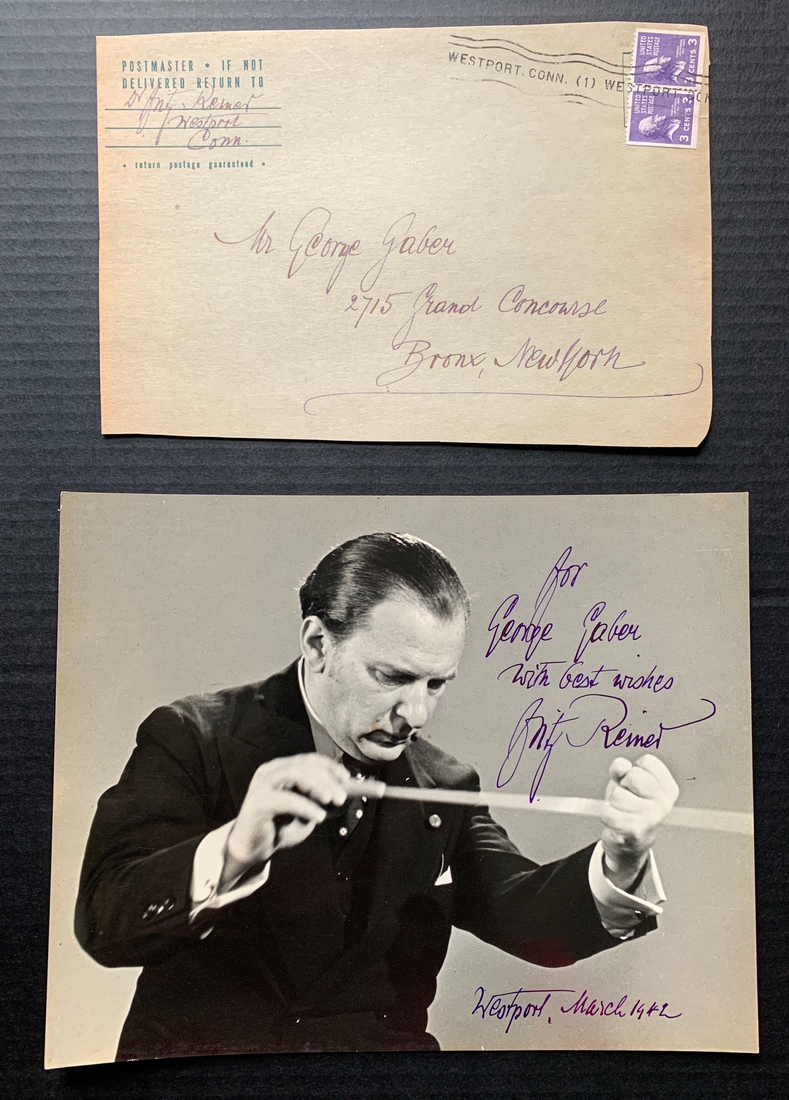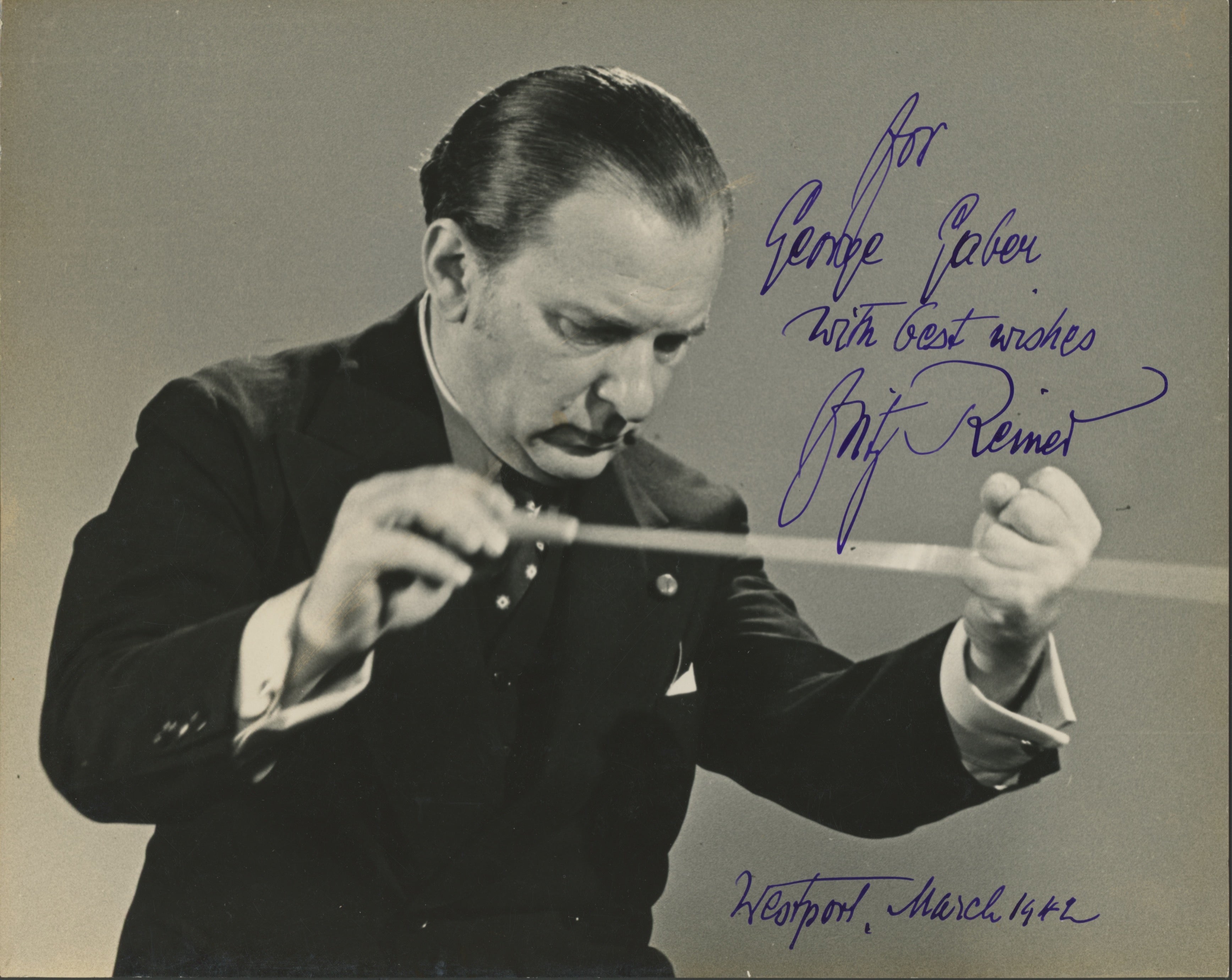 Reiner, Fritz. (1888–1963). Signed Photograph. Original Rudolf H. Hoffmann of NY photograph of the legendary conductor of the Pittsburgh Symphony Orchestra (1938-48) and of the Chicago Symphony Orchestra (1953-1962), who has inscribed "For George Gaber with best wishes/ Fritz Reiner/ Westport, March 1942."  Together with fragment from transmissal envelope, addressed and signed in Reiner's hand.  Light edge wear, some silvering to lower left quadrant, else fine.  9.625 x 7.75 inches (24.4 x 19.7 cm.).