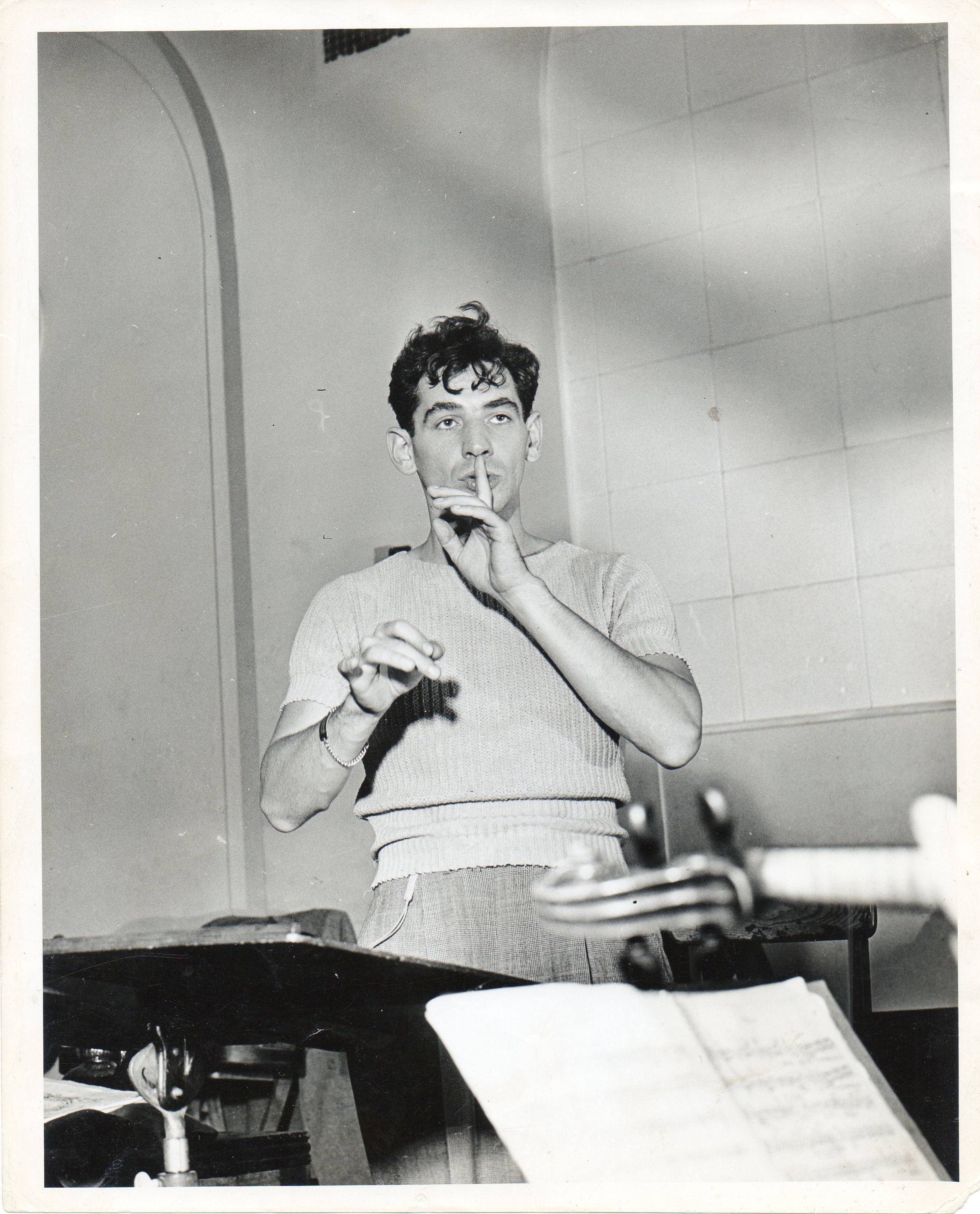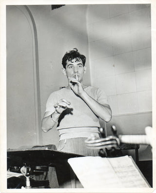 Remarkable original ca. 1946 photograph of the very young conductor, shown on the podium in rehearsal, with one finger raised against his lips. A stunning image. 8 x 10 inches, light wear to edges, stamps and clippings on verso, small loss to lower right corner margin, else in very fine condition.
