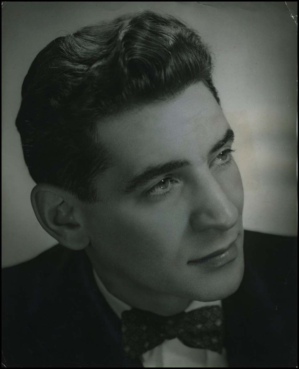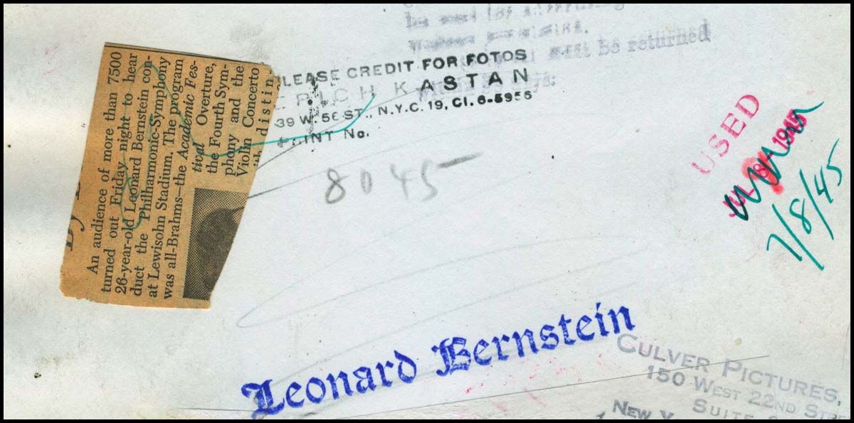 Original portrait photograph, c. 1940, by Emerich Kastan. On the verso, in addition to numerous later stamps, is Bernstein's personal blue ownership stamp. The young conductor used this stamp through his early career, including while at Harvard, to mark the books in his library and to identify publicity photographs which at this early stage, he was probably distributing himself! 8 x 10 inches, very unusual.