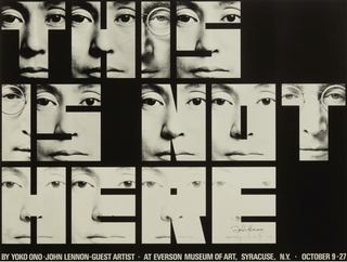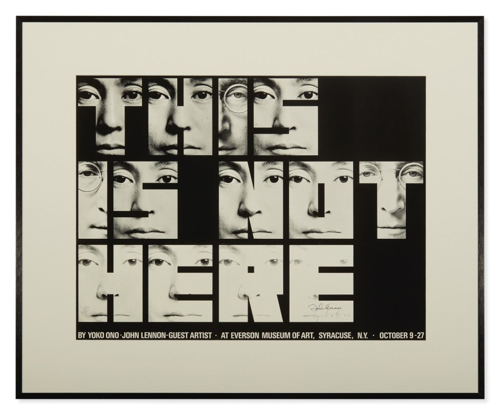 [The Beatles] Lennon, John. (1940–1980) & Ono, Yoko. (b. 1933). 'This Is Not Here' – Signed Exhibition Poster. Extremely rare limited edition 18 x 24 poster for the 'This Is Not Here' exhibition held from October 9-27, 1971, at the Everson Museum of Art in Syracuse, numbered 69/100, boldly signed in black felt tip, "John Lennon" and "Yoko Ono." In very fine condition, the sheet hinged along the edges of the reverse to the mat. Framed without glazing. The exhibition of Ono's artwork—billed as 'a show of unfinished paintings and sculpture'—featured Lennon as a guest artist and opened on his birthday in 1971. Limited to just one hundred signed examples, this is a very difficult-to-find piece of the utmost desirability.