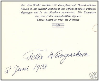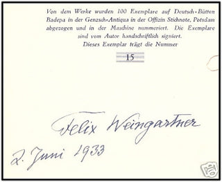Weingartner, Felix. (1863–1942). Terra: Ein Symbol. SIGNED.. Potsdam: Verlag Müller & Kiepenheuer. 1933. First Limited Edition. Terra: Ein Symbol. Prolog/Drei Spiele/Epilog. 578 pp. Signed copy number 15 of only 100 examples. In very good condition. A rare item from the Austrian conductor, composer and pianist who studied with Liszt. A beautiful volume, in marbled boards and gilt-stamped leather label at spine. Threads holding the folios to binding are loose, otherwise very good overall.