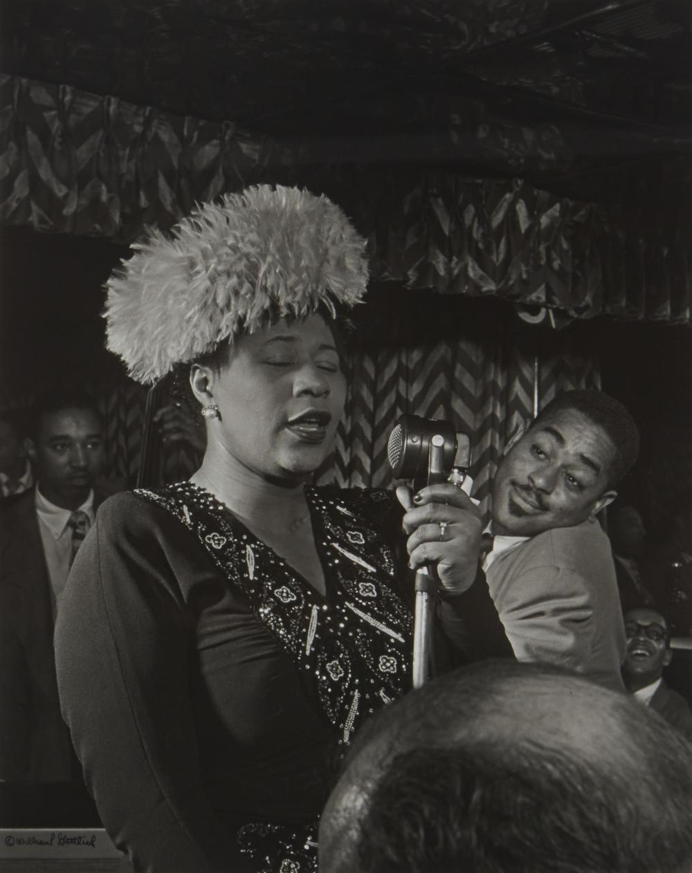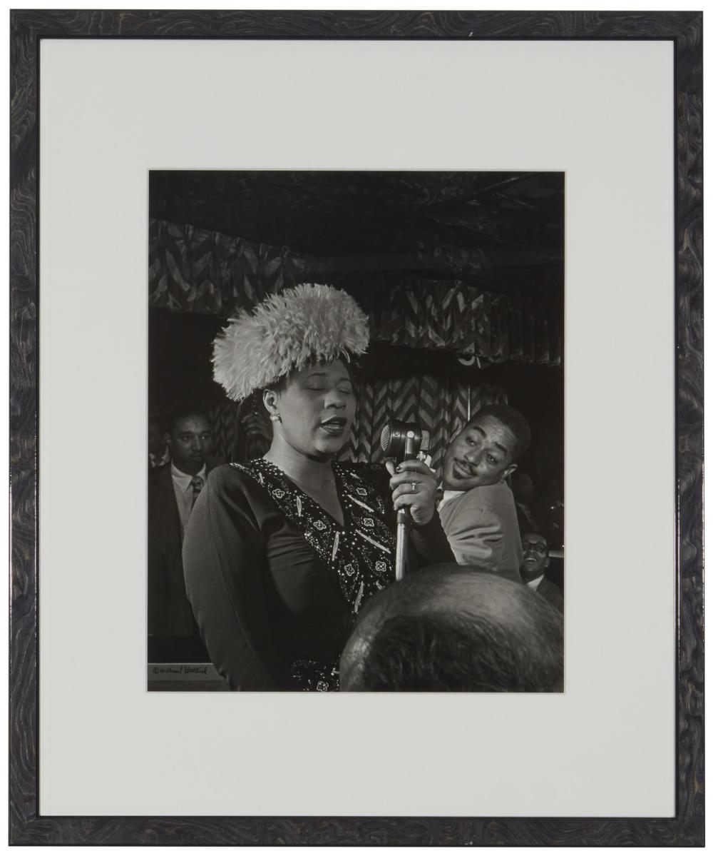 One of the most iconic of all jazz photographs, William Gottlieb's depiction of the legendary jazz performers mid-set at the Downbeat Club in New York City, Fitzgerald looking out over the audience as Gillespie gazes at her with admiration. Gelatin silver print, circa 1946-48; printed later. With photographer's signature to lower left corner and photographer's stamp to verso. Not examined out of frame but in apparently fine condition. Sight: 10.25 x 13.25 inches (26 x 33.6 cm.).; framed to 17.25 x 21.25 inches (43.8 x 53.9 cm.). Literature: The Golden Age of Jazz, Pomegranate Artbooks, 1995, p. 100.