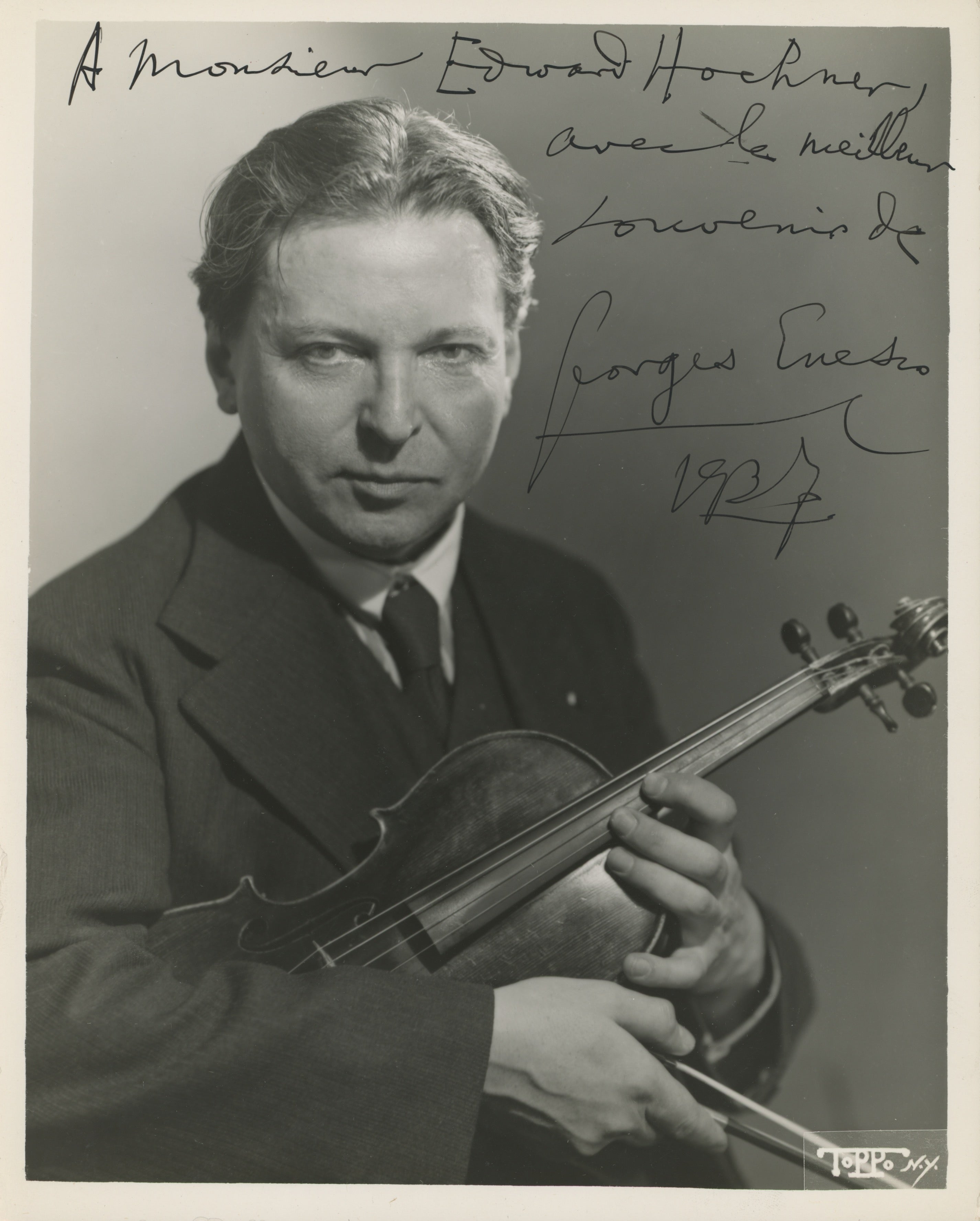 Signed Toppo of NY doubleweight photograph of the Romanian-born violinist and composer, who has inscribed to Edward Hochner, Box Office Treasurer of the New York Philharmonic, "À monsieur Edward Hochner, / avec le meilleur / souvenir de / Georges Enesco / 1937." In very fine condition. 8 x 10 inches (20.3 x 25.4 cm.).