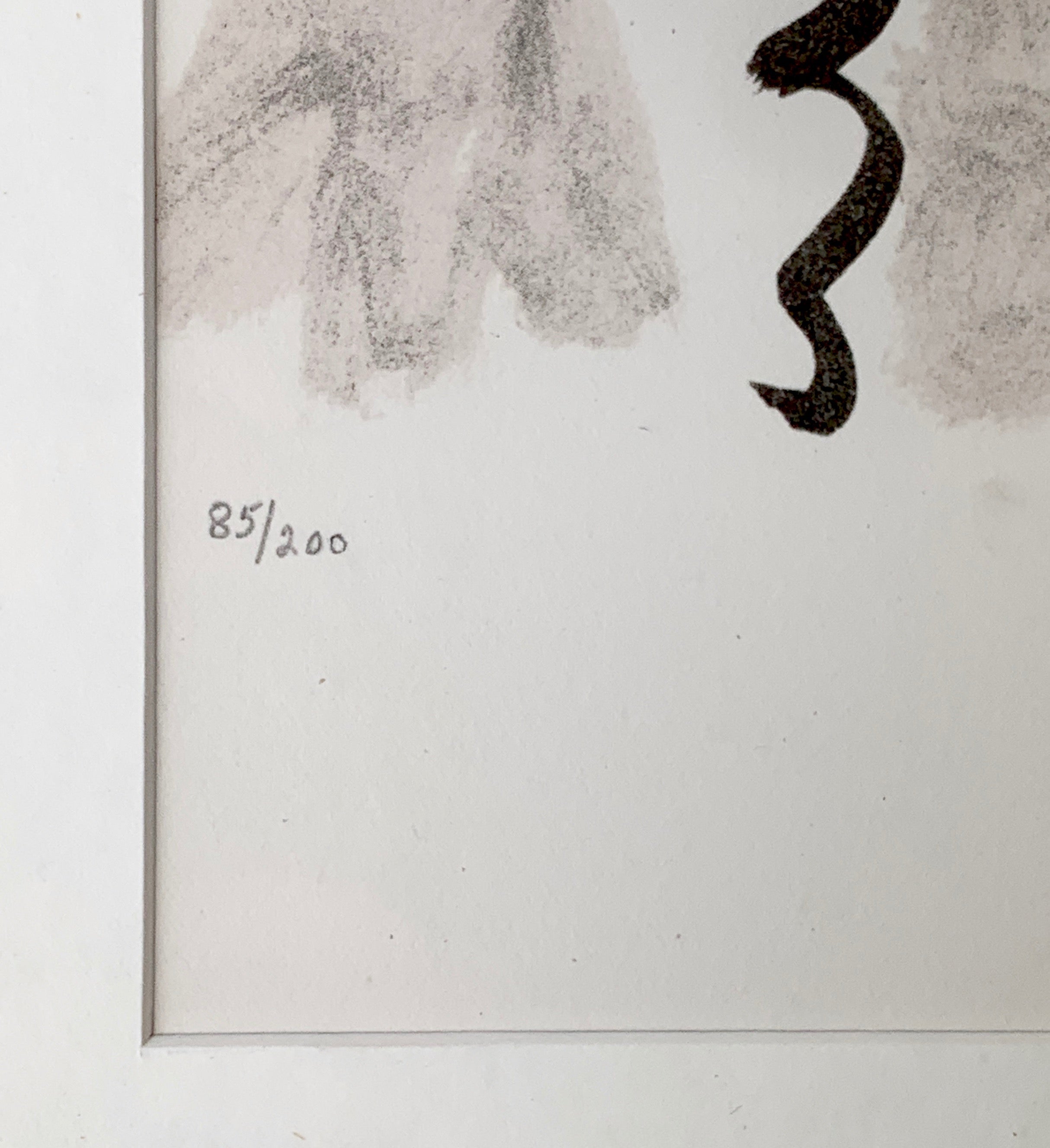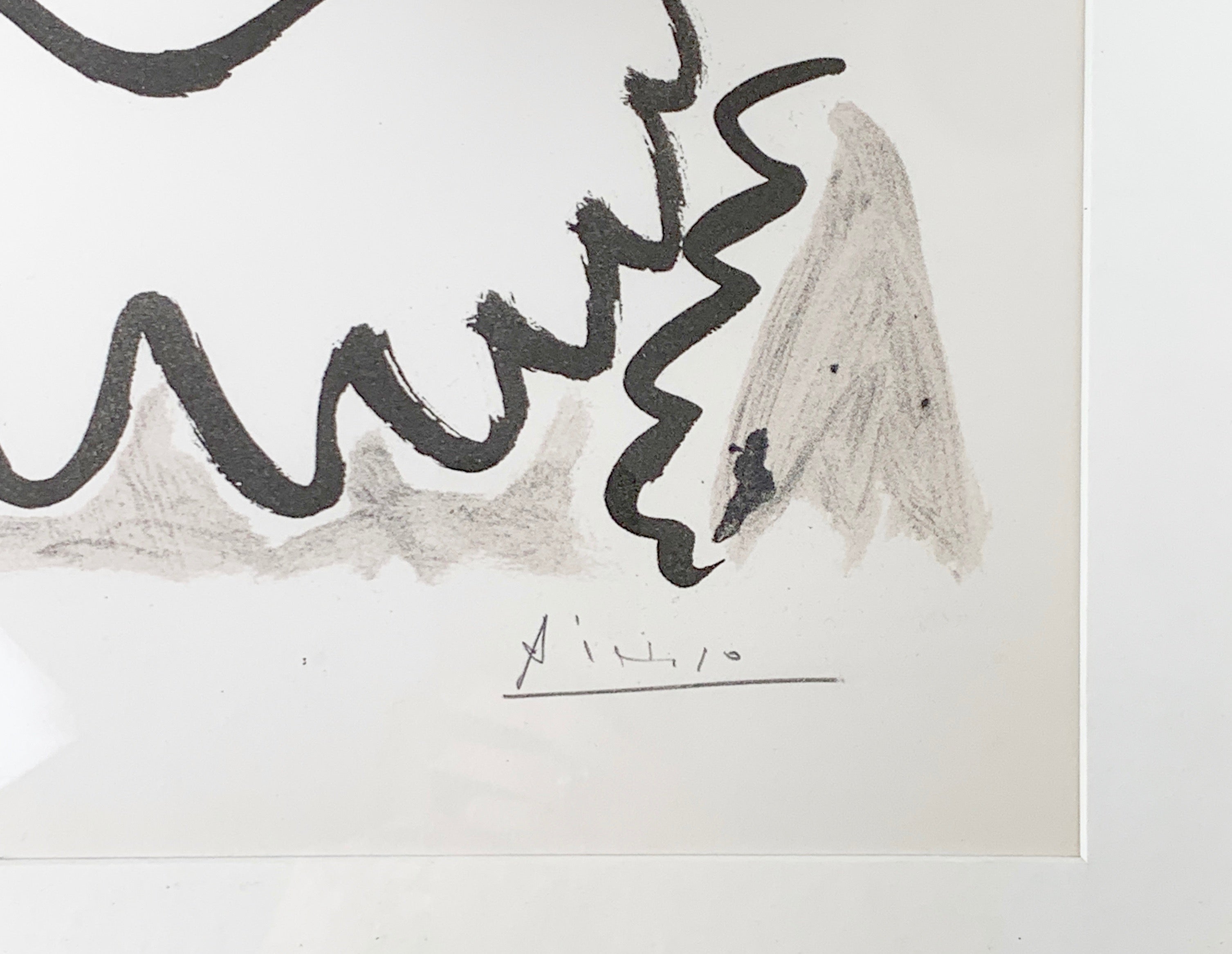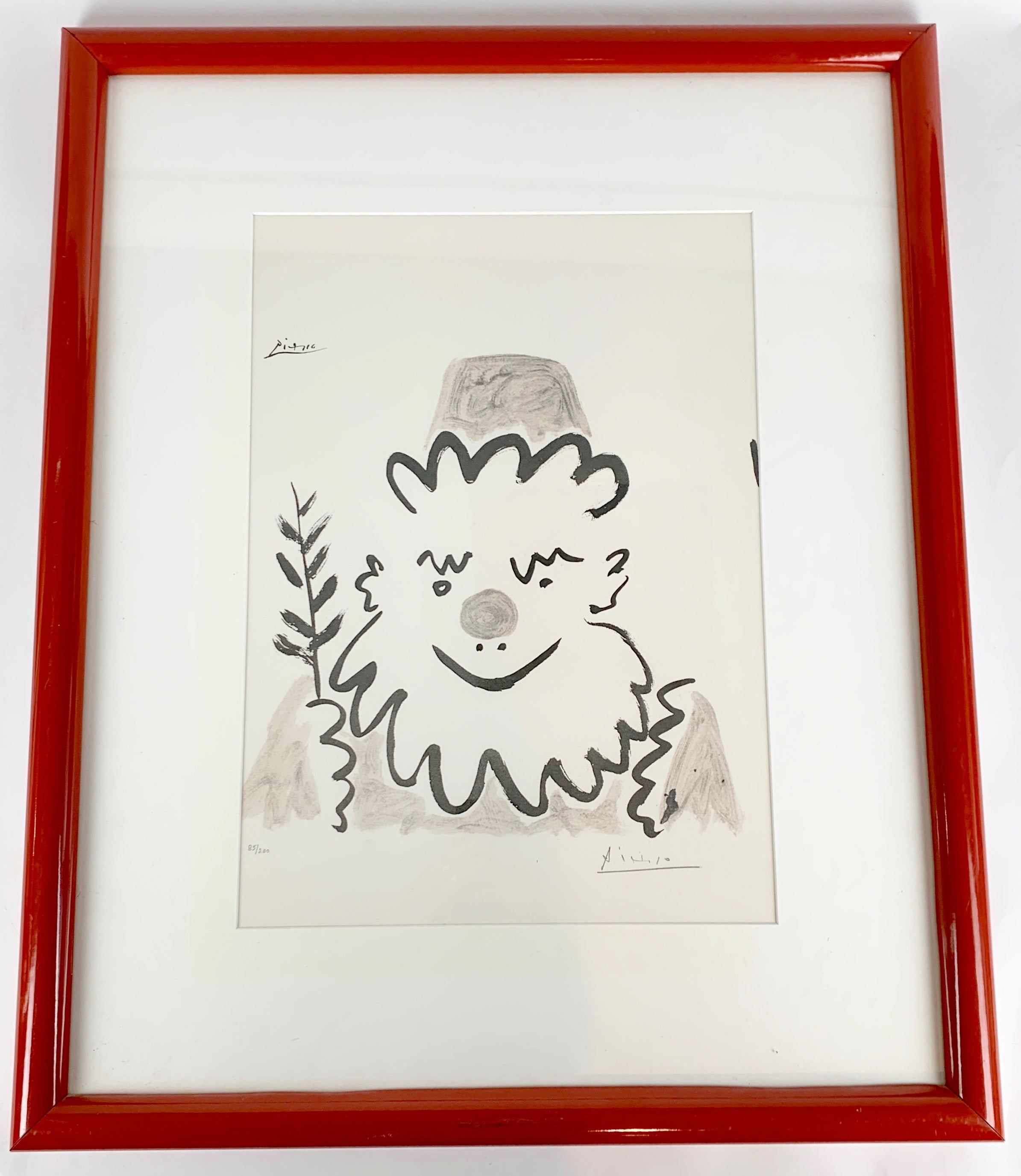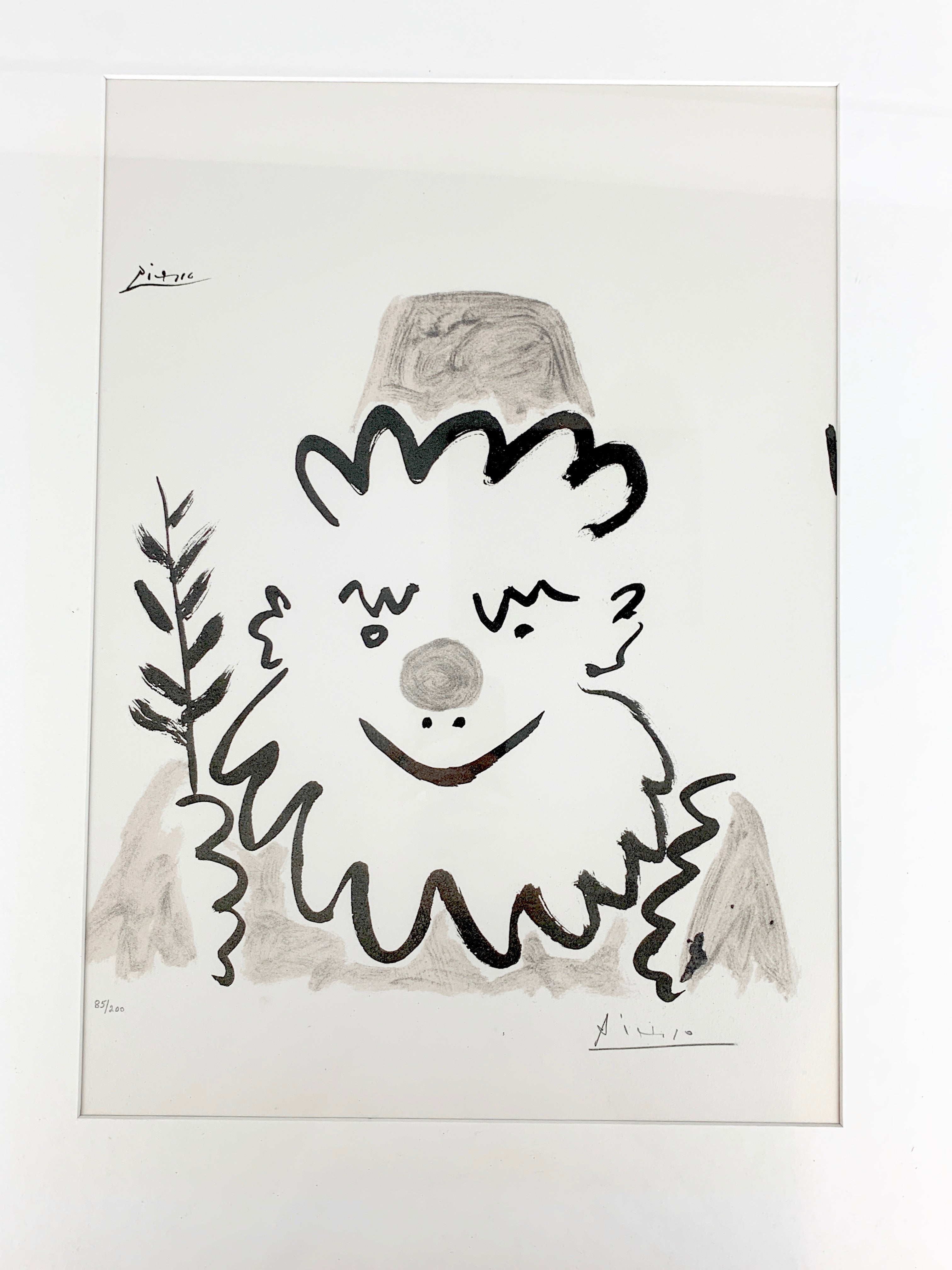 Picasso, Pablo. (1881–1973). Père Noël, 1957 - Signed Lithograph. Amusing lithograph on wove paper of the Spanish artist's Father Christmas, or Santa Claus. Hand signed by Picasso and numbered 85 from the edition of 200 along the lower edge. Horizontal and vertical scuffs, some affecting the image; mild spotting, most notably to the verso; somewhat sun-faded. Sheet 15.1 x 21.5 inches (38.5 x 54.6 cm.), matted and framed under acrylic to an overall size of 24 x 29.5 inches (61 x 75 cm.).