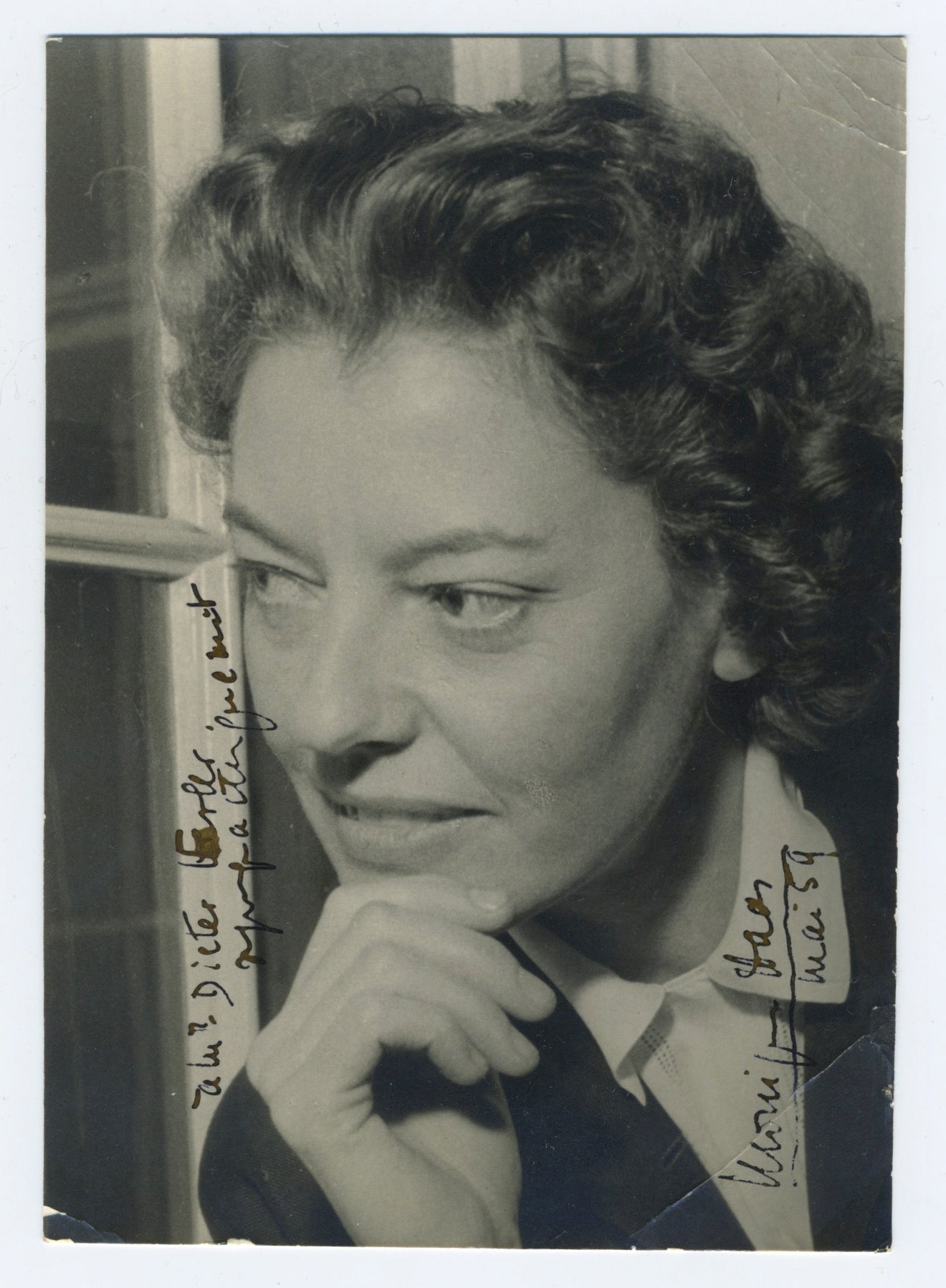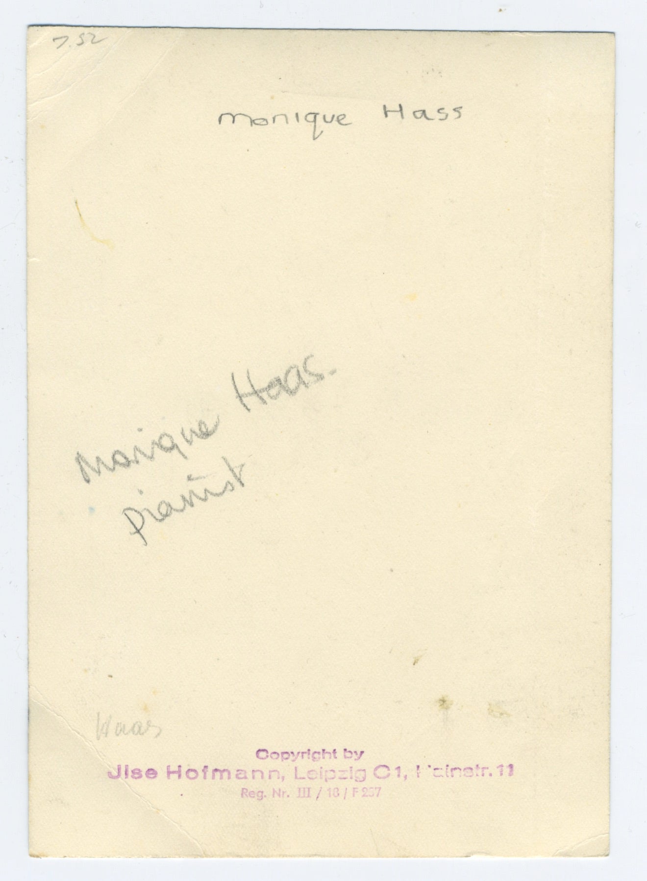 Haas, Monique. (1909–1987). Signed Photograph. Uncommon signed original Jise Hofmann of Leipzig photograph of the French pianist, who has inscribed "À Mr. Dieter [unintelligible] / sympatiquement / Monique Haas / Mai '59." Photographer's stamp to verso, creases to corners, light wear along lower and right edges, else in fine condition. 4 x 5.5 inches (10 x 14 cm).