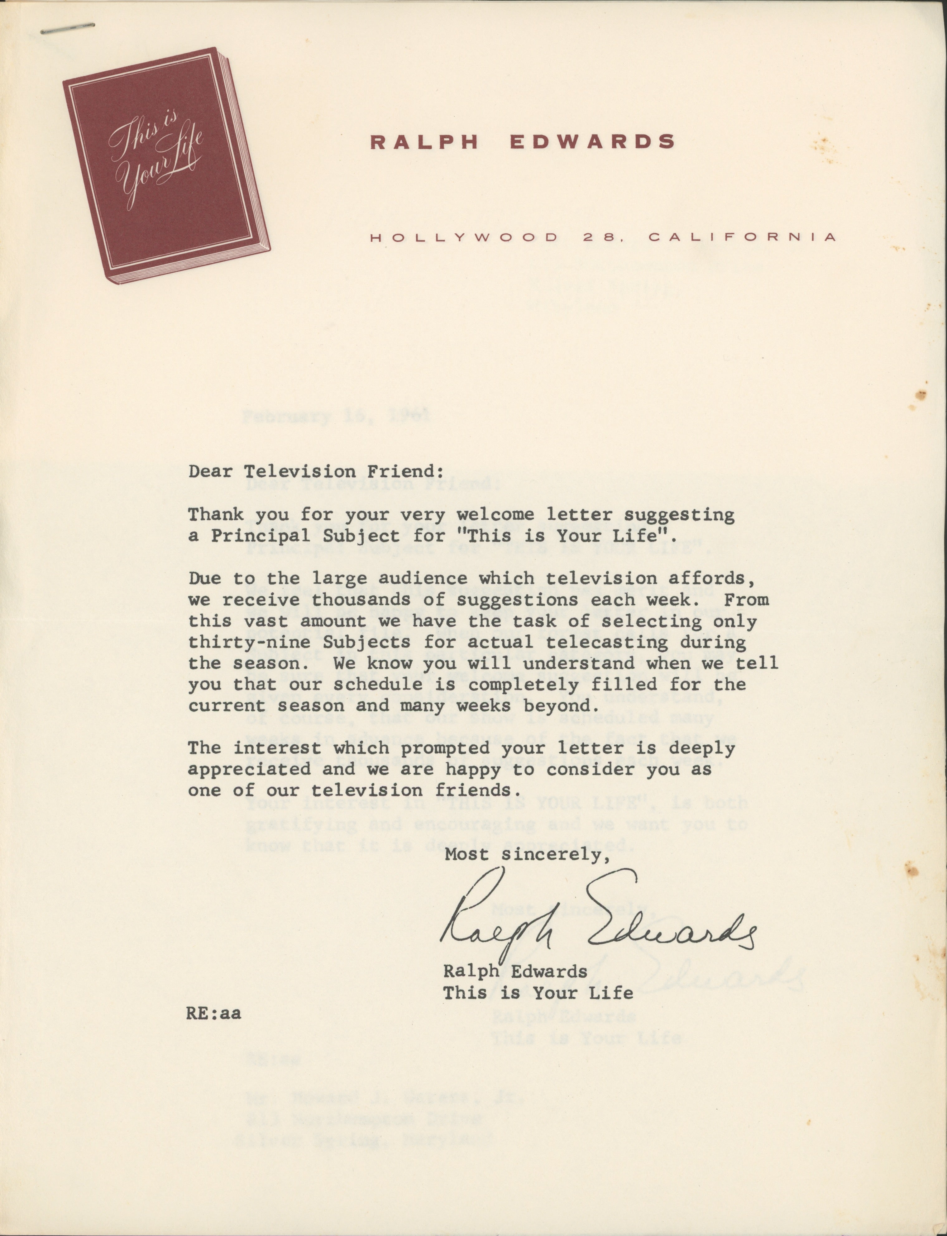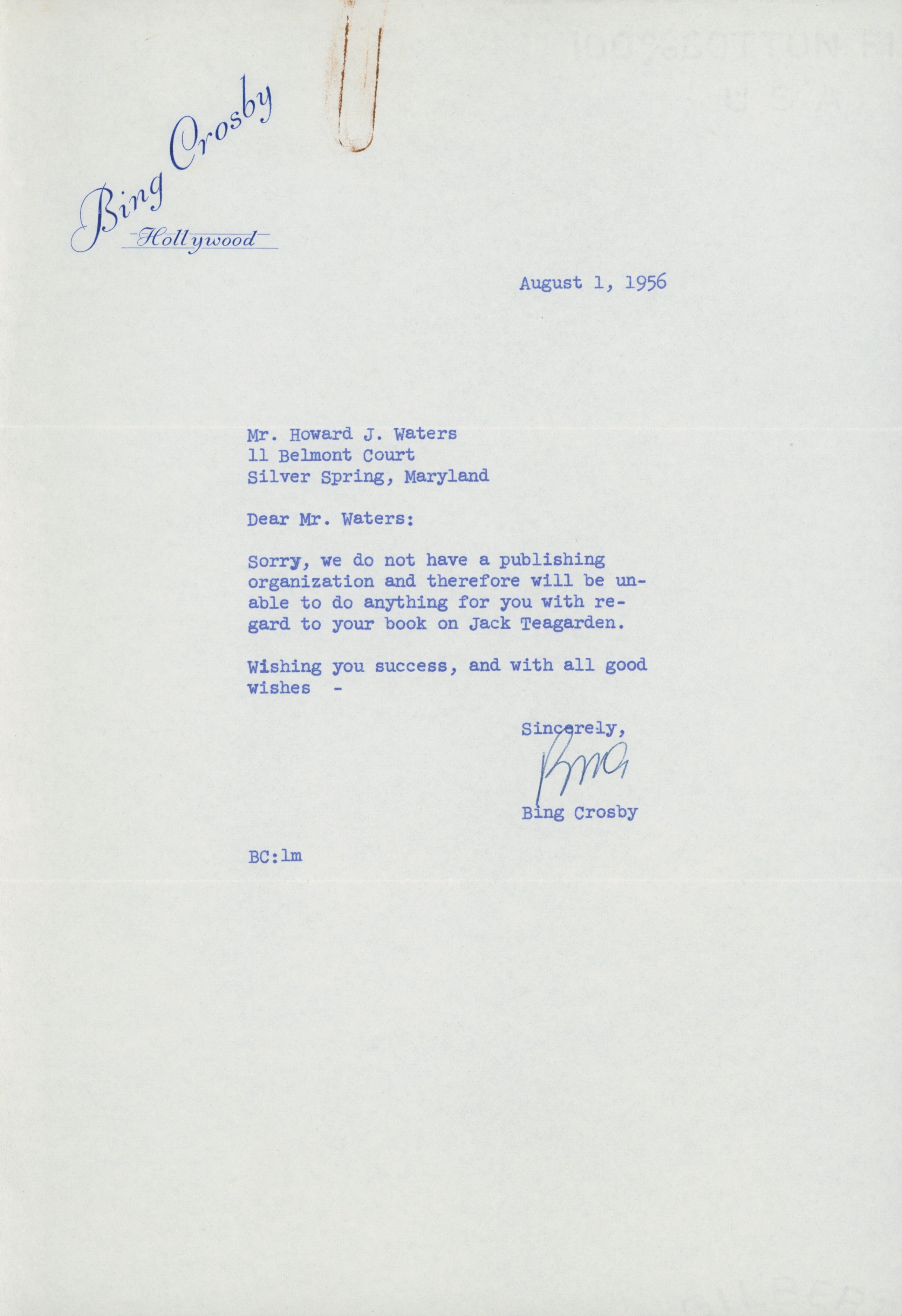 The TLS from Crosby (August 1, 1956; 1 p. on personal stationary), who frequently worked with Teagarden, appears to be in response to an inquiry from Waters about interest in publishing his book. In part, "Sorry, we do not have a publishing organization and therefore will be unable to do anything for you with regard to your book on Jack Teagarden." The TLS from Ralph Edwards (Undated; 1 p. on This Is Your Life stationary) is in response to Waters' suggestion of Teagarden as a subject for the program. It reads, in part, "Thank you for your very welcome letter suggesting a Principal Subject for This Is Your Life. / Due to the large audience which television affords, we receive thousands of suggestions each week. From this vast amount we have the task of selecting only thirty-nine Subjects for actual telecasting during the season. We know you will understand when we tell you that our schedule is completely filled for the current season and many weeks beyond."