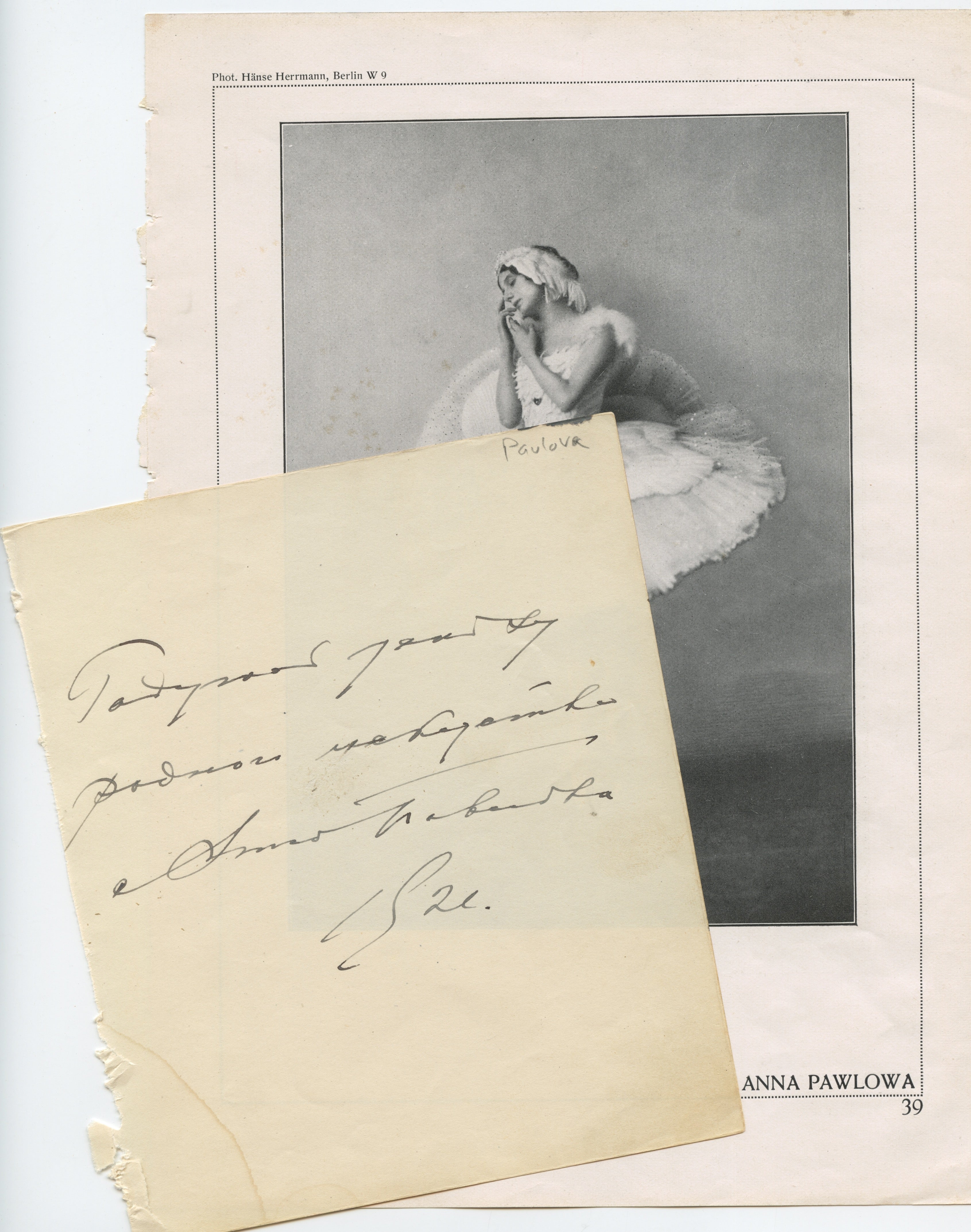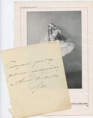 Autograph signature and inscription from the great Russian ballerina, who has signed and inscribed in black ink to an autograph album leaf, dated 1921. Small corner stain to blank left lower corner, else in fine condition. 5.25 x 6.25 inches (13.3 x 15.9 cm.). Sold together with an excised page from an unidentified period publication, with halftone photographs of the dancer by Hänse Herrmann of Berlin to each side.