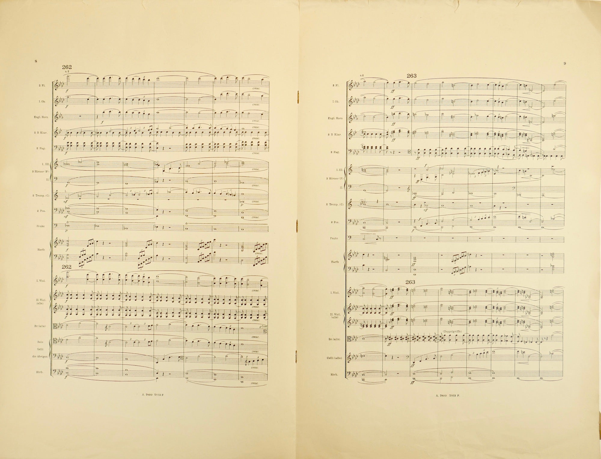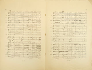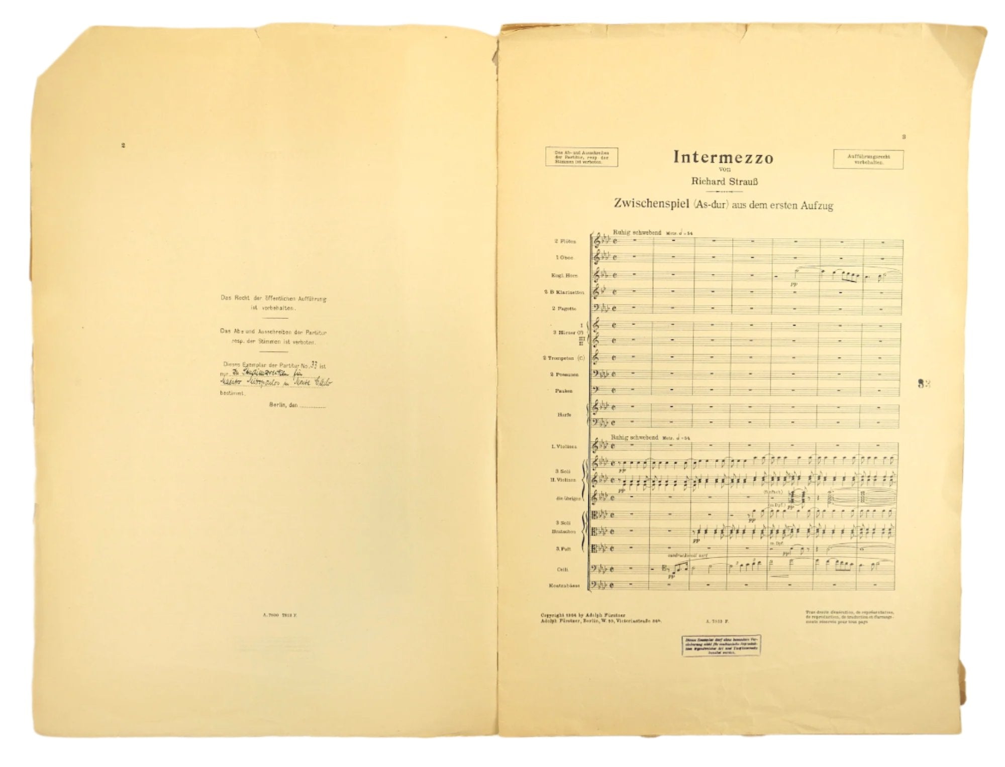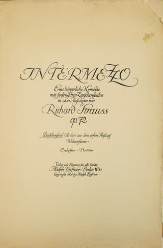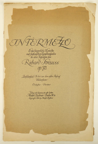 Intermezzo / Eine bürgerliche Komödie mit sinfonischen Zwischenspielen in zwei Aufzügen... Op. 72 / Zwischenspiel (As dur) aus dem ersten Aufzug / Walzerszene / Orchester-Partitur.  Full score of the interlude in A-flat major from the first act of the opera.  Upright folio.  Wrappers present.  Lithograph after plates.  [PN] A. 7800 7813 F.  Title (lithographed from manuscript) with performing rights notice to verso; 3–15 pp.  Performing rights notice has blank filled in in manuscript (translated here), "this copy of score no. [manuscript: "33"] is intended only [continuation in manuscript] for further study by Maestro Mitropoulos in Monte Carlo." From Mitropoulos's personal collection.  18.5 x 12.5 inches (47.5 x 31.6 cm).  Wrappers detached and brittle with fraying and significant loss at all edges; major tear to upper wrapper; score bumped to upper edge with crease to upper right corner; overall in good condition.