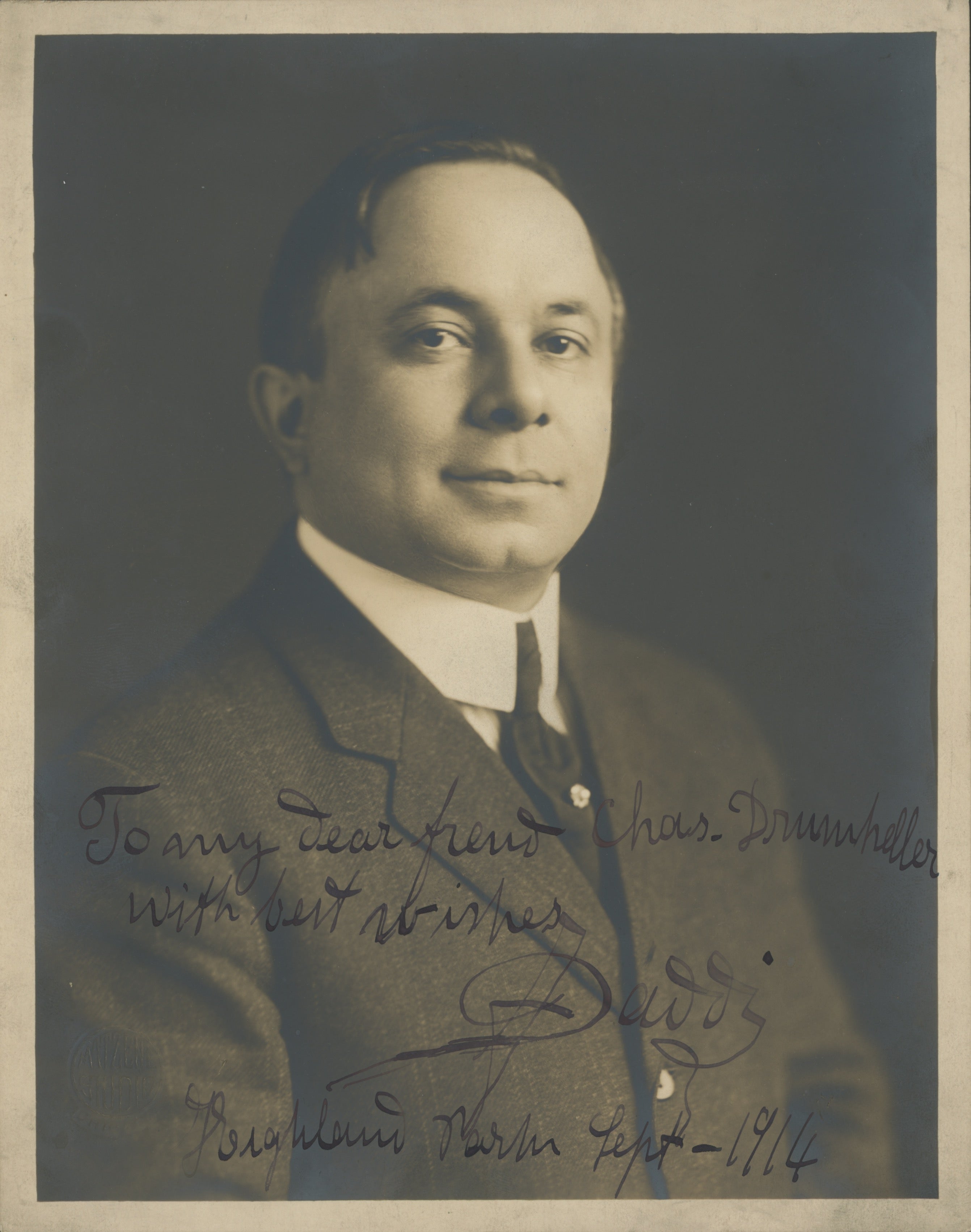 Signed Matzene Studio of Chicago doubleweight photograph of the Italian tenor (later, bass), creatore of the role of Beppe in Leoncavallo's Pagliacci. Inscribed to Charles Drumheller, tenor and longtime rehearsal pianist at the Metropolitan and Chicago Lyric Opera: "To my dear friend Chas. Drumheller / with best wishes / F. Daddi / Highland Park Sept—1914."  Embossed photographer's mark to lower left corner.  In very fine condition.  8 x 10 inches (20.3 x 25.4 cm.).