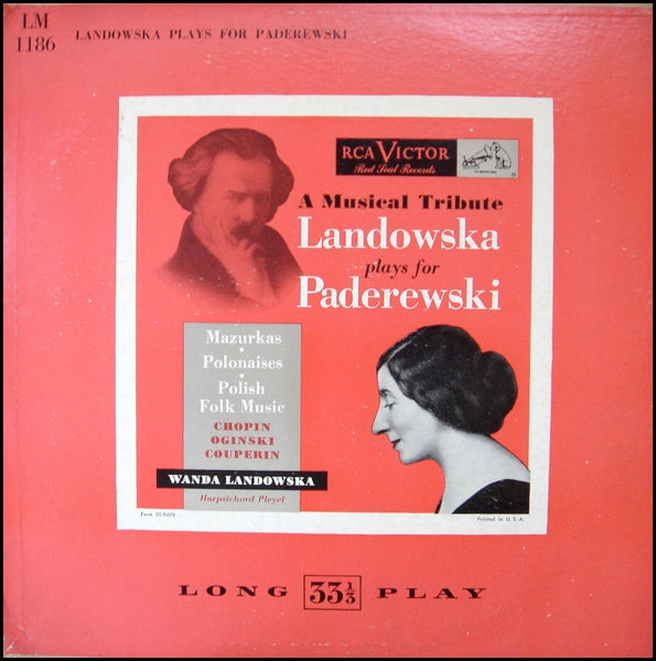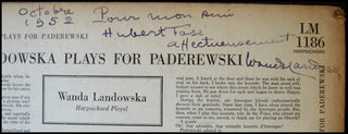A very unusual item from the great harpischordist, inscribed on the jacket verso "Octobre 1952, pour mon ami Hubert Fass, Affectuesement Wanda Landowska." Landowska issued this collection of Polish music in 1951 as an homage to Paderewski and it has been more recently reissued as "Dances of Ancient Poland."