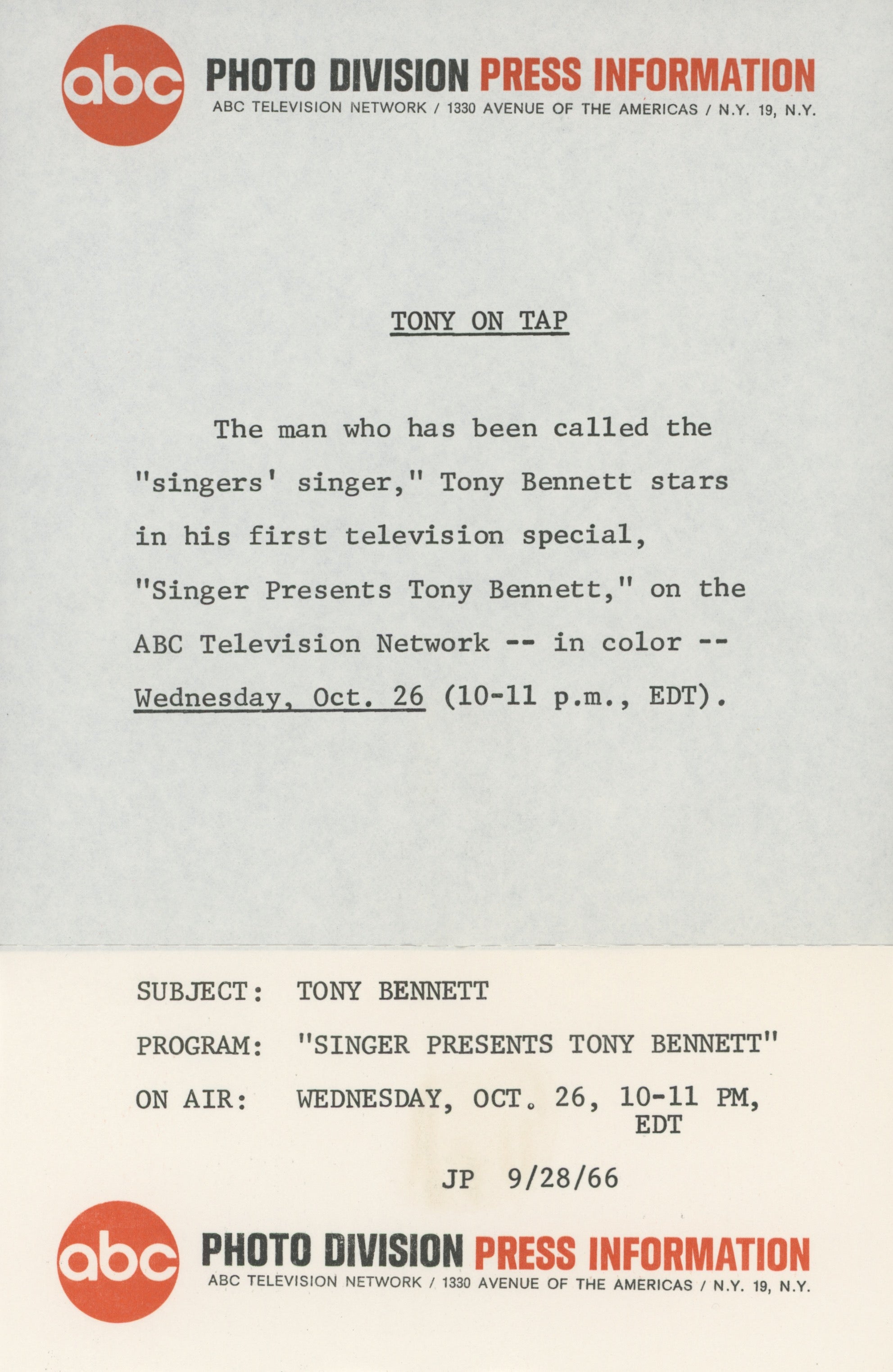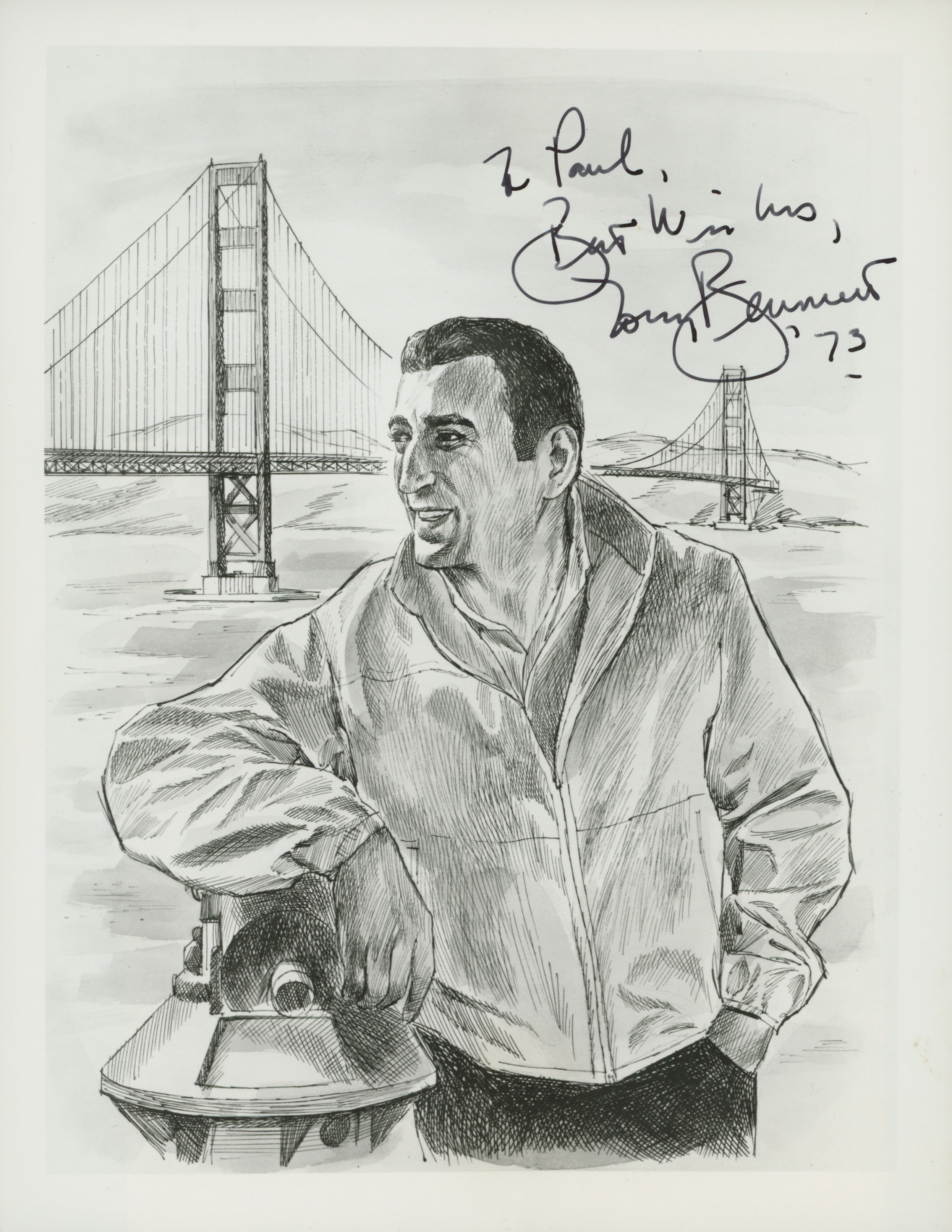 Signed photographic reproduction of an illustrated portrait of the legendary jazz singer, who is shown leaning against a telescope with the Golden Gate Bridge in the background, a reference to Bennett's signature tune "I left my heart in San Francisco" written by George City and Douglass Cross, which became the official city song. Bennett has inscribed "To Paul, / Best Wishes, / Tony Bennett / '73" in black felt tip. The ABC Television Network press release mounted to verso reads, in part, "The man who has been called the 'singer's singer,' Tony Bennett stars in his first television special, Singer Presents Tony Bennett, on the ABC Television Network -- in color." Slight ripple to lower margin, else in very fine condition. 7 x 9 inches (17.8 x 22.9 cm.).