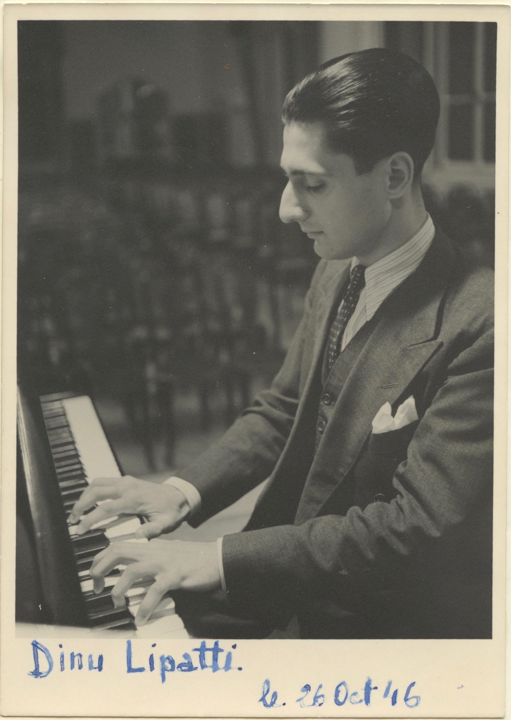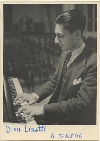 Handsome vintage original photograph of the celebrated Romanian pianist and composer whose life was cut short by Hodgkin's disease at age 33, shown seated at the piano. Considered one of the finest pianists of the 20th century, he left an impressive recorded legacy despite the brevity of his performing career. Penned in blue ink along the lower margin, "Dinu Lipatti / le 26 Oct '46", presumably by the photographer E. Matter of Gstaad, whose has stamped the verso. This intimate portrait of the artist before an empty auditorium was apparently taken before a concert in Switzerland. Mounting remnants to verso, in fine condition. 4.15 x 5.75 inches (10.6 x 14.6 cm.).