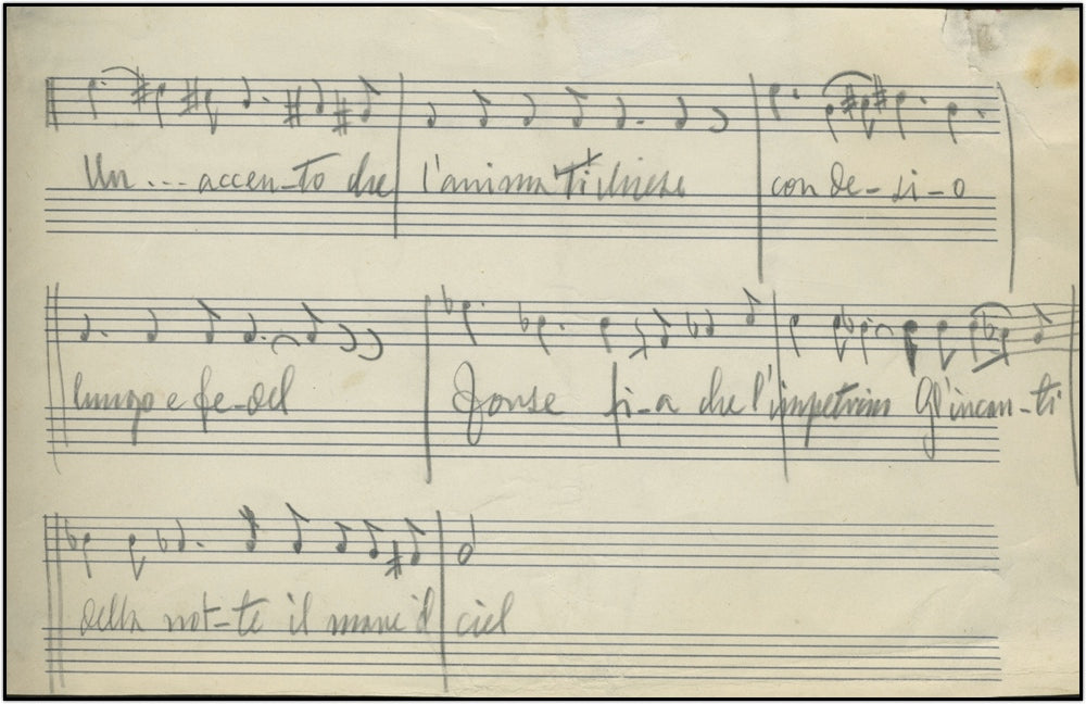 Tosti, Sir Francesco Paolo. (1846-1916). Autograph Musical Manuscript Fragment. A fine unsigned musical fragment with 3 lines of a song on manuscript paper.
