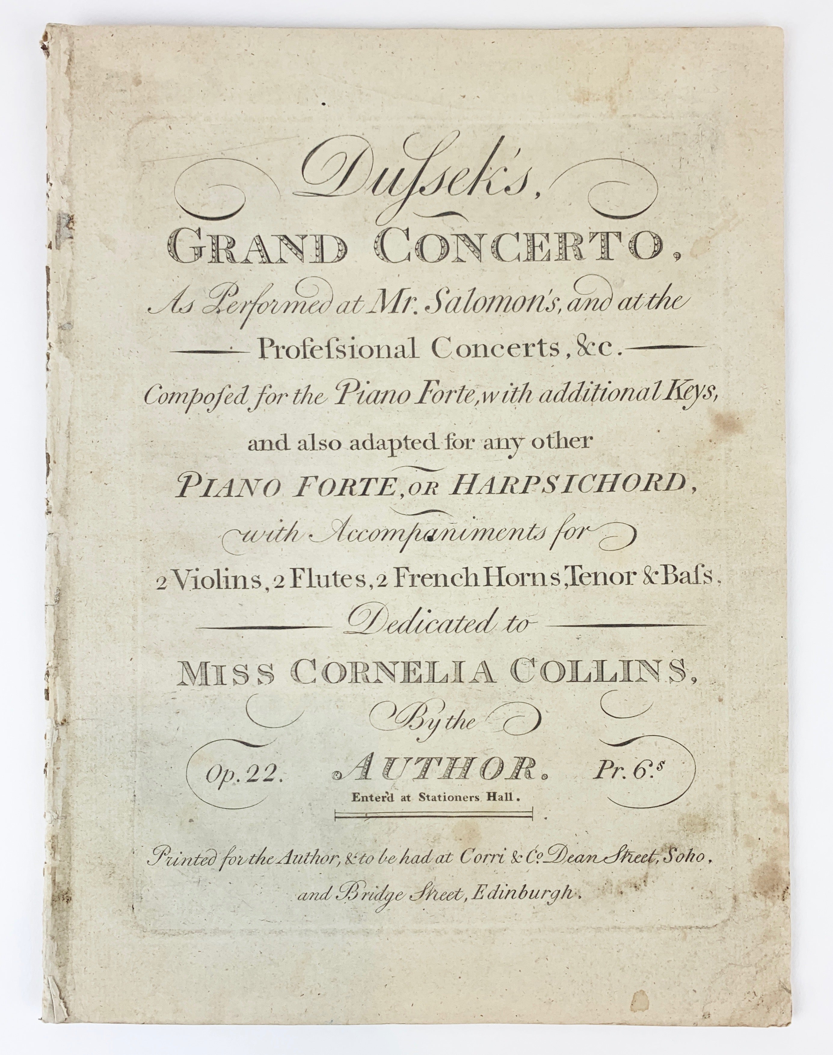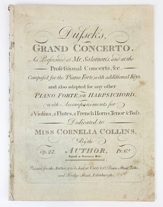 Dussek's Grand Concerto, As Performed at Mr. Salomon's, and at the Professional Concerts, &c. Composed for the Piano Forte, with additional Keys, and also adapted for any other Piano Forte, or Harpsichord, with Accompaniments for 2 Violins, 2 Flutes, 2 French Horns, Tenor & Bass. Dedicated to Miss Cornelia Collins by the Author, Op. 22. Printed by the Author, Edinburgh. [No PN] Title, [vb]; 1-22. Engraved throughout. Disbound.