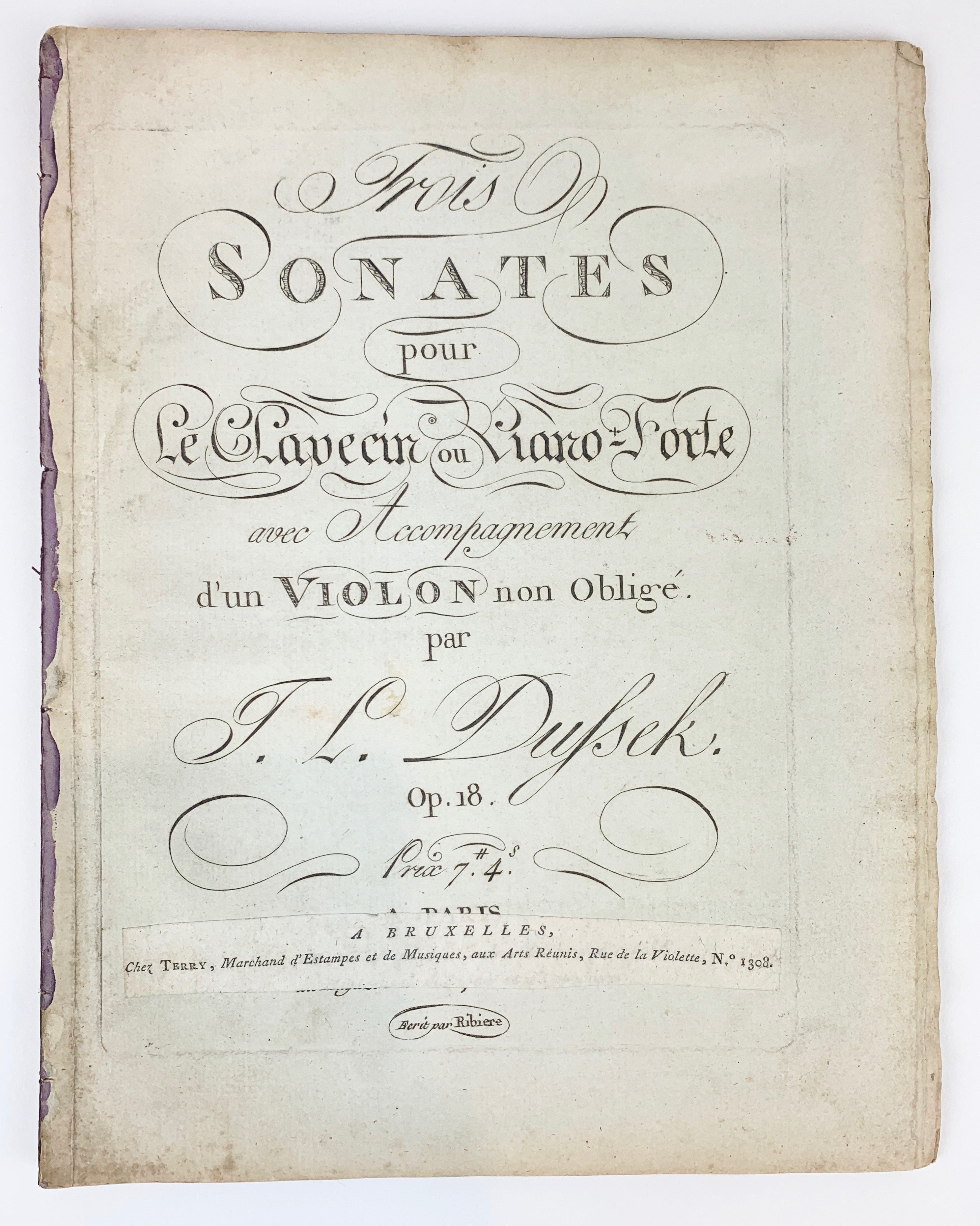 Trois Sonates pour Le Clavecin ou Piano Forte avec Accompagnement d'un Violon non Obligé par J. L. Dussek. Op. 18. Chez Le Duc, Paris, with later publisher's ticket laid over the original publisher imprint. [No PN] Title, [vb]; 1-42. Engraved throughout. Disbound.