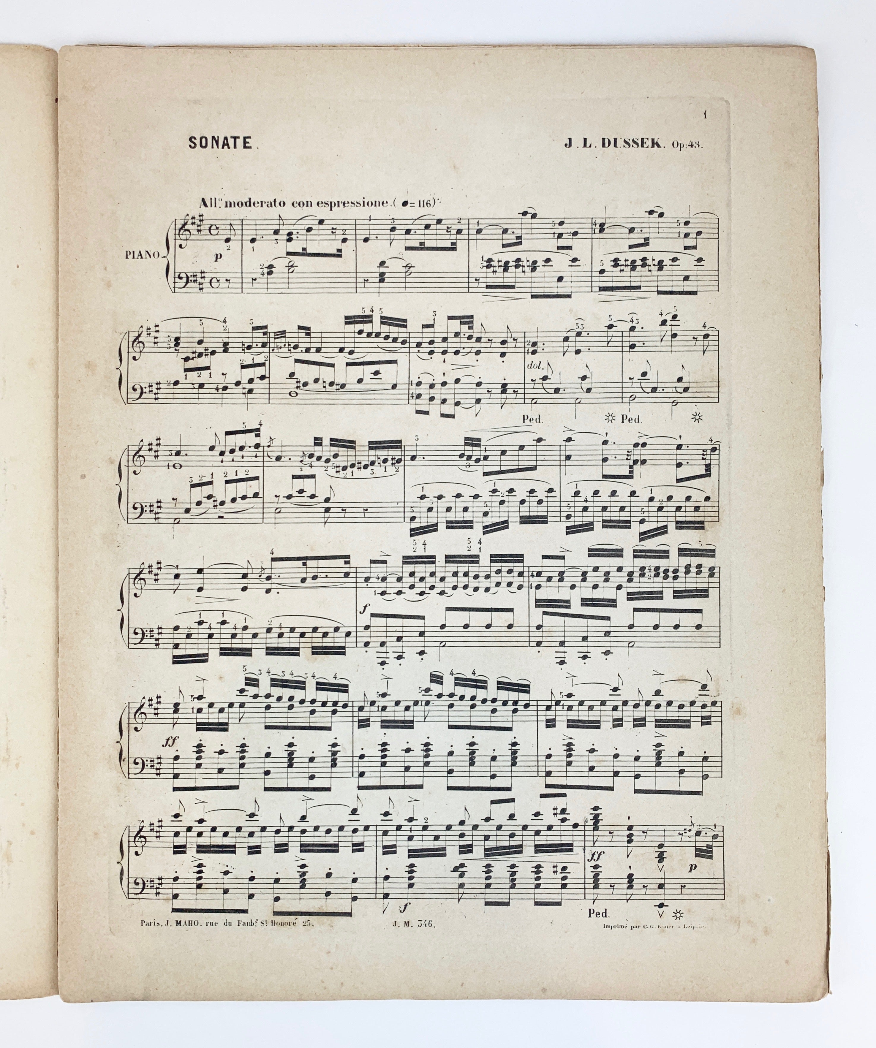 Grande Sonate en la majeur (Allegro) par Dussek, Op. 43. J. Maho, Paris. [PN J. M. 346] Title, [vb]; 1-11. Lithograph cover, otherwise engraved.