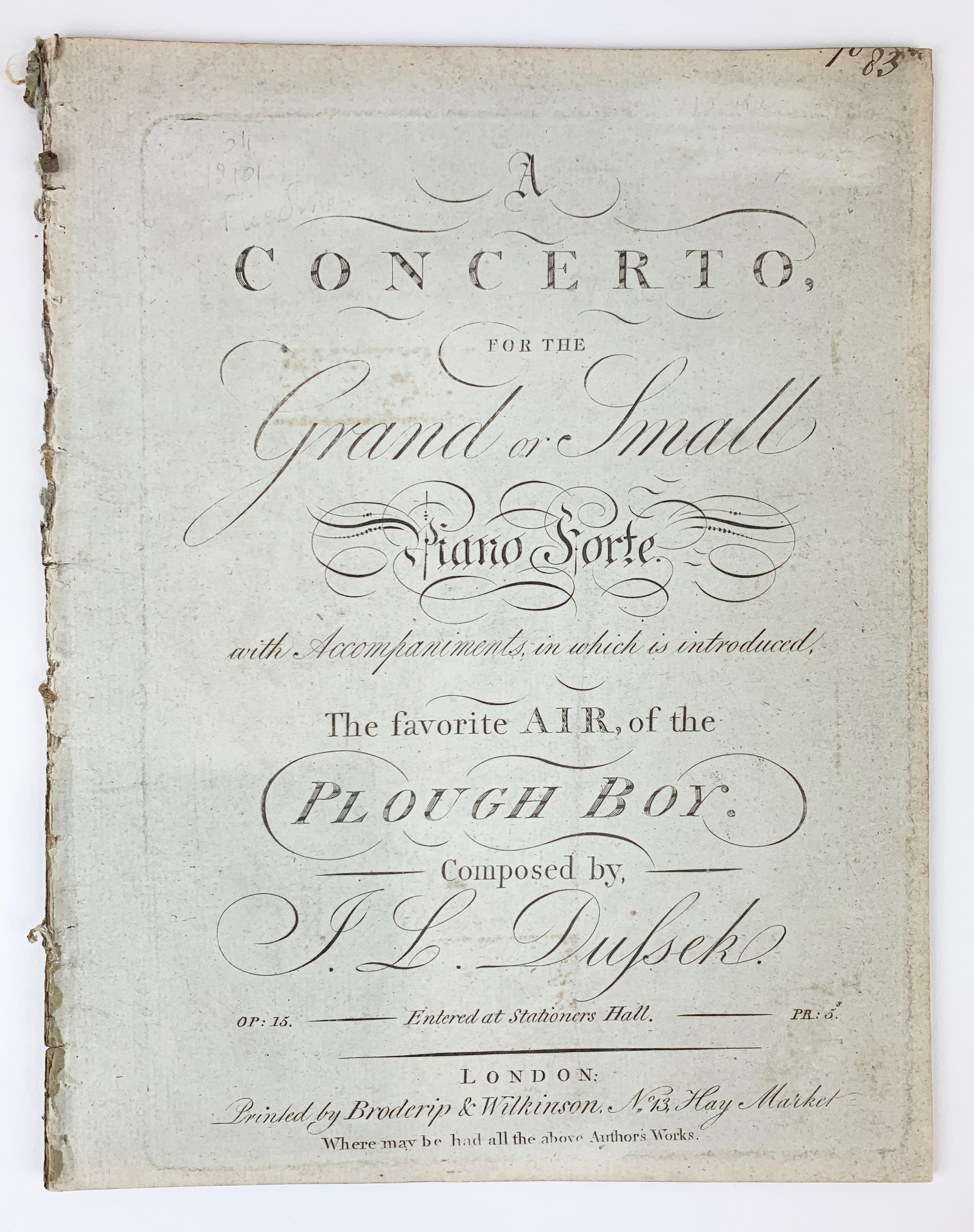 A Concerto, for the Grand or Small Piano Forte, with Accompaniments, in which is introduced, The favorite Air, of the Plough Boy. Composed by, J. L. Dussek. Op. 15. Broderip & Wilkinson, London. [PN C] Title, [vb]; [b], 2-19. Engraved throughout. Disbound.