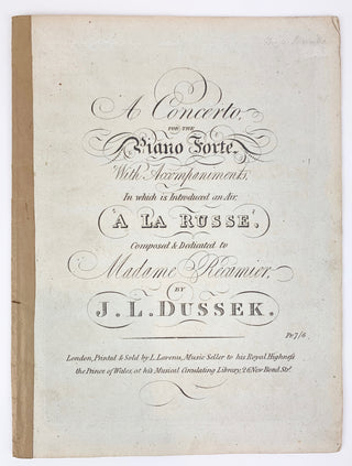 A Concerto for the Piano Forte, with Accompaniments, In which is Introduced an Air, "A La Russe," Composed & Dedicated to Madame Recamier, by J. L. Dussek. L. Lavenu, London. [No PN] Title, 2-16. Engraved throughout.