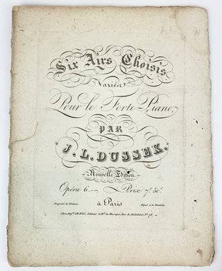 Six Airs Choisis Variés Pour le Forte Piano, par J. L. Dussek. Nouvelle Edition. Opéra 6. Chez Aug.te Le Duc, Paris. [No PN] Title, [vb]; [b], 2-25. Engraved throughout. Disbound.