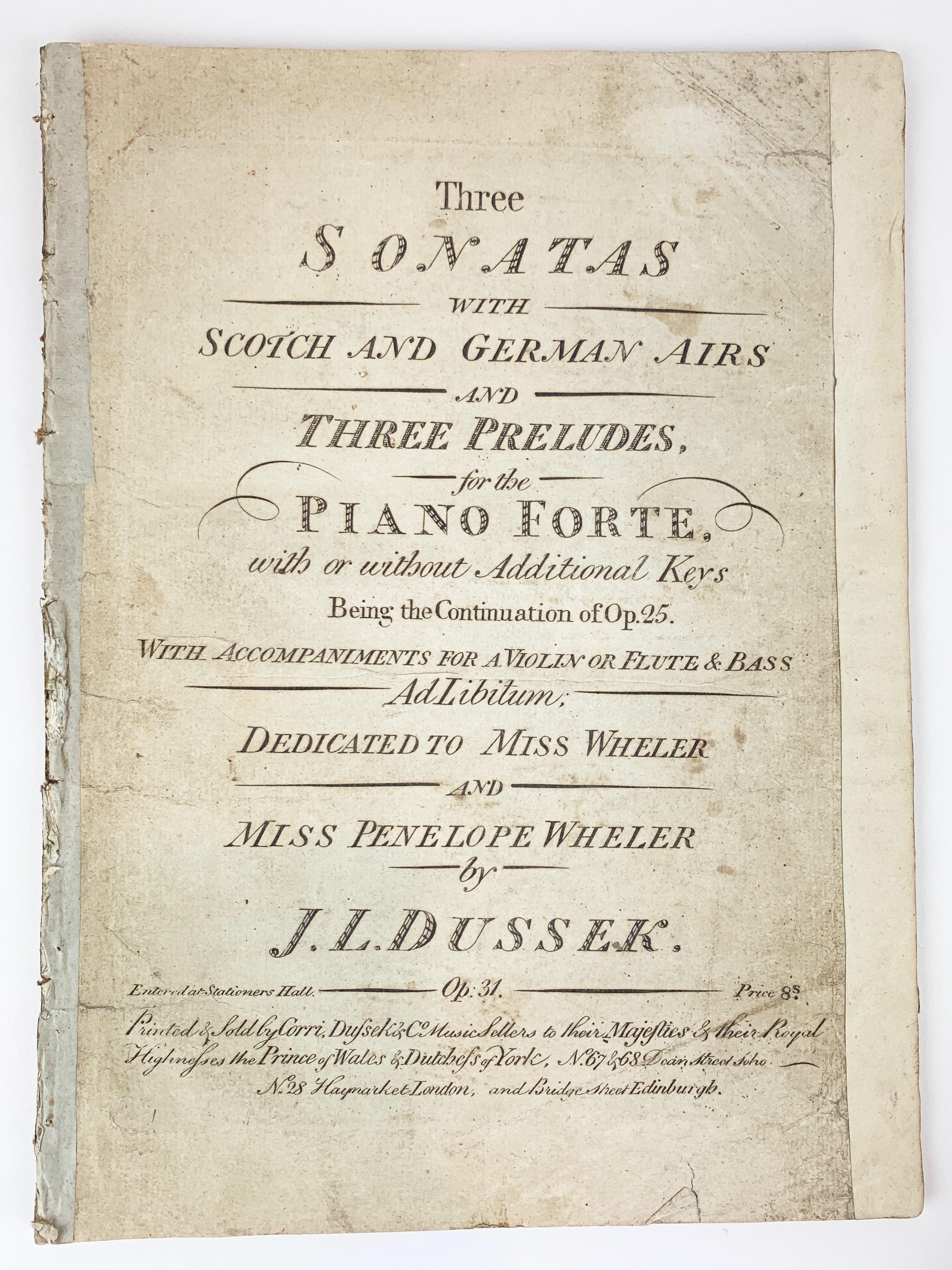 Three Sonatas with Scotch and German Airs and Three Preludes, for the Piano Forte, with or without Additional Keys Being the Continuation of Op. 25. With Accompaniments for a Violin or Flute & Bass Ad Libitum. Dedicated to Miss Wheler and Miss Penelope Wheler by J. L. Dussek. Op. 31. Corri, Dussek & Co., London. [No PN] Title, [vb]; 2-37, catalogue. Engraved throughout. Disbound.