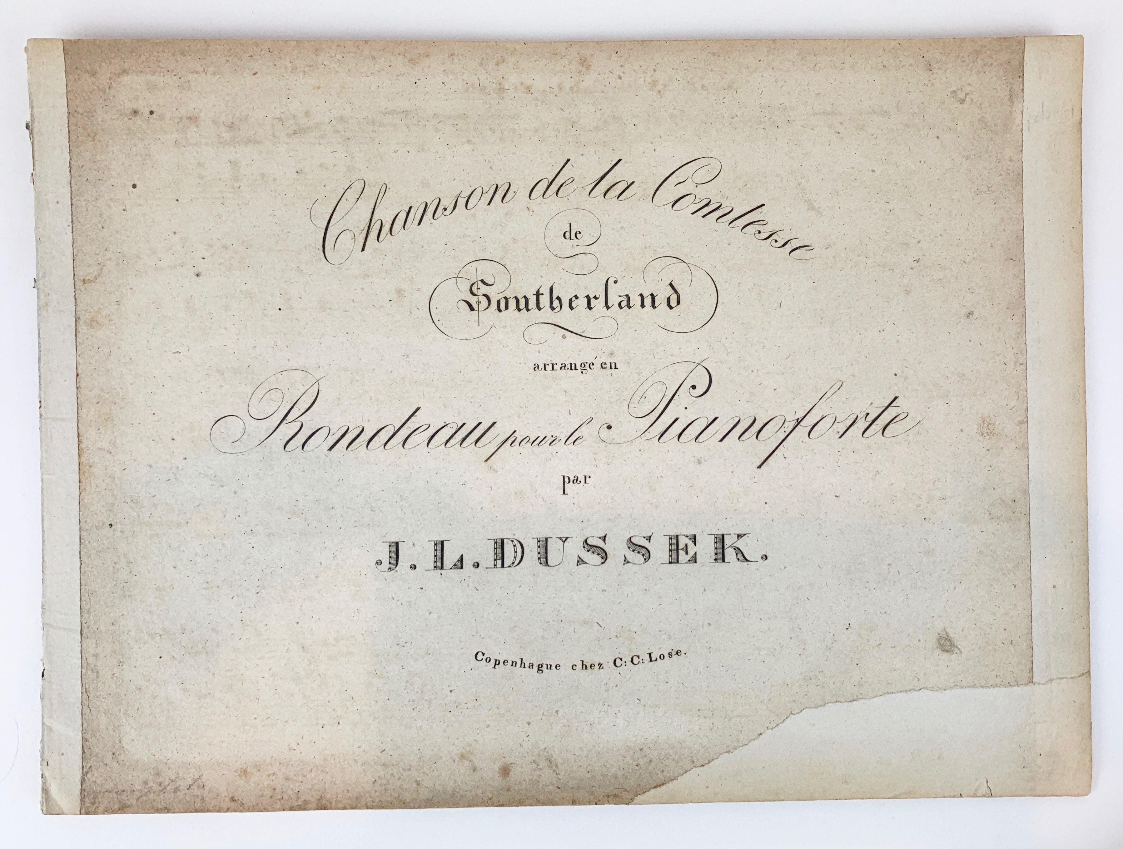 Chanson de la Comtesse de Southerland arrangé en Rondeau pour le Pianoforte par J. L. Dussek. C. C. Lose, Copenhague. [No PN] Title, 38-43. Engraved throughout. Pencil marks throughout, reinforcement to lower right corner of cover. Disbound.