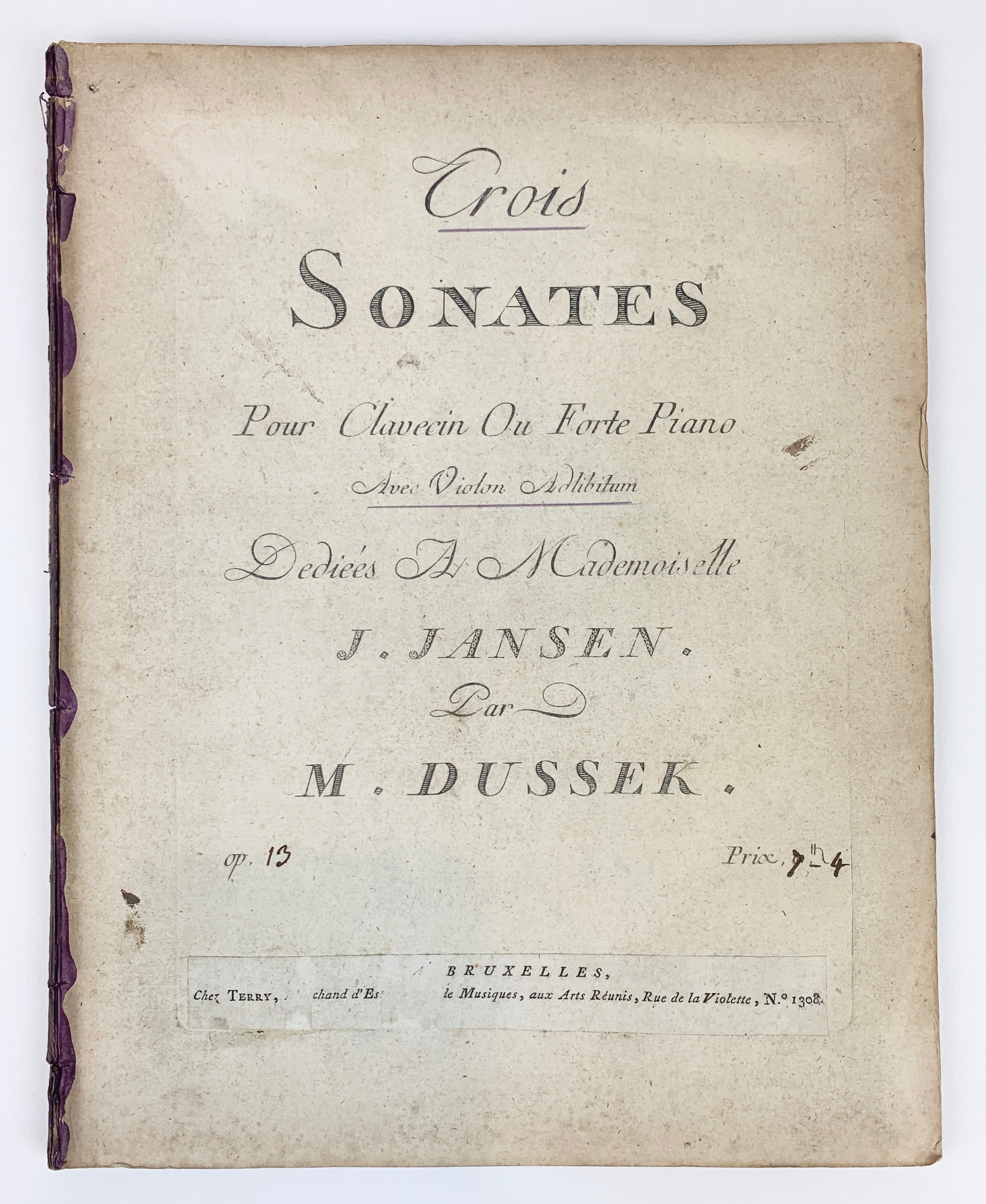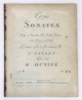 Trois Sonates Pour Clavecin Ou Forte PIano Avec Violin Adlibitum Dediées À Mademoiselle J. Jansen. Par M. Dussek. Op. 13. Terry, Bruxelles. [No PN] Title, [vb]; [b], 2-31. Engraved throughout. Disbound.