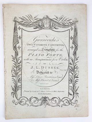 Giornovichi's Two Favorite Concertos, arranged as Sonatas for the Piano Forte, with an Accompaniment for a Violin, by J. L. Dussek. Dedicated to Miss Louisa Boscawen de Visme, & Miss Harriet de Visme. Corri & Co., London. [No PN] Title, 2-34. Engraved throughout. Disbound.