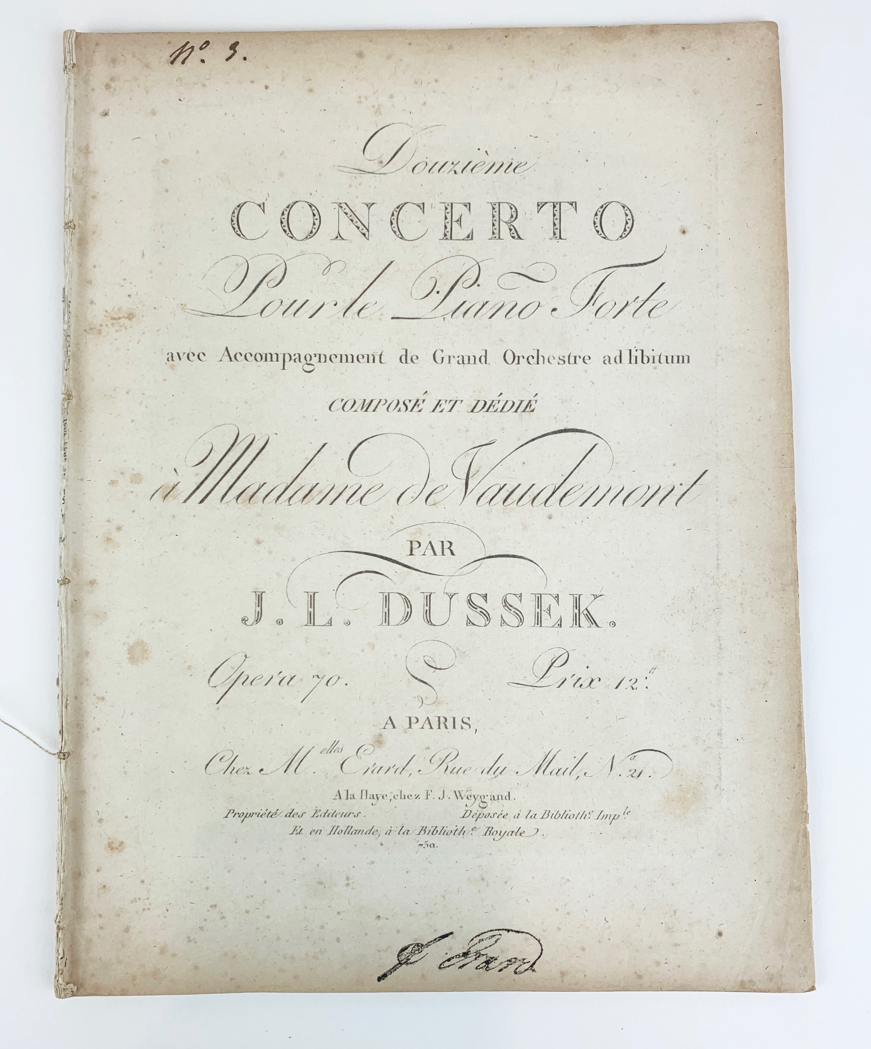 Douzième concerto Pour le Piano Forte avec Accompagnement de Grand Orchestre ad libitum composé et dédié à Madame de Vaudemont par J. L. Dussek. Opera 70. Chez Melles Erard, Paris. [PN 740] Title, [vb]; [b], 3-32. Engraved throughout. Signature to lower margin of title page reads "G. Erard." Disbound.
