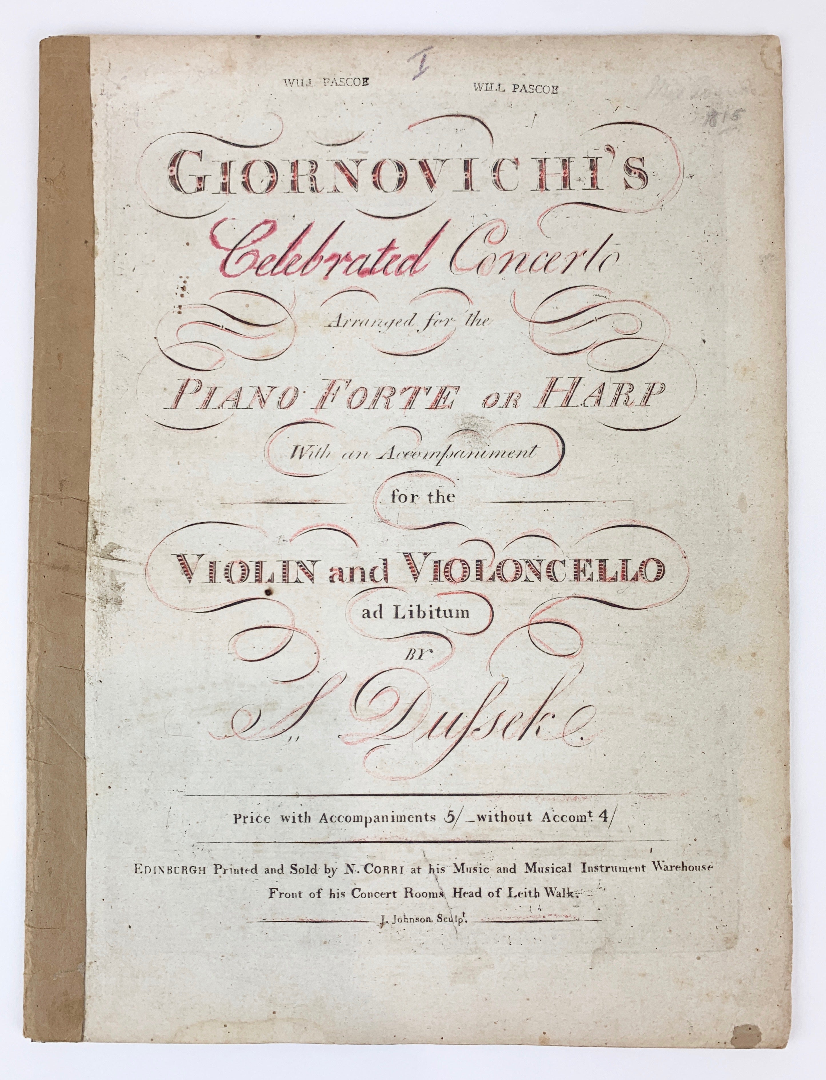 Giornovichi's Celebrated Concerto Arranged for the Piano Forte or Harp With an Accompaniment for the Vioilin and Violoncello ad Libitium by J. Dussek. N. Corri, Edinburgh. [PN C C] Title, 2-14. Engraved throughout. Reinforced binding and additional rear wrapper with significant pencil marks.