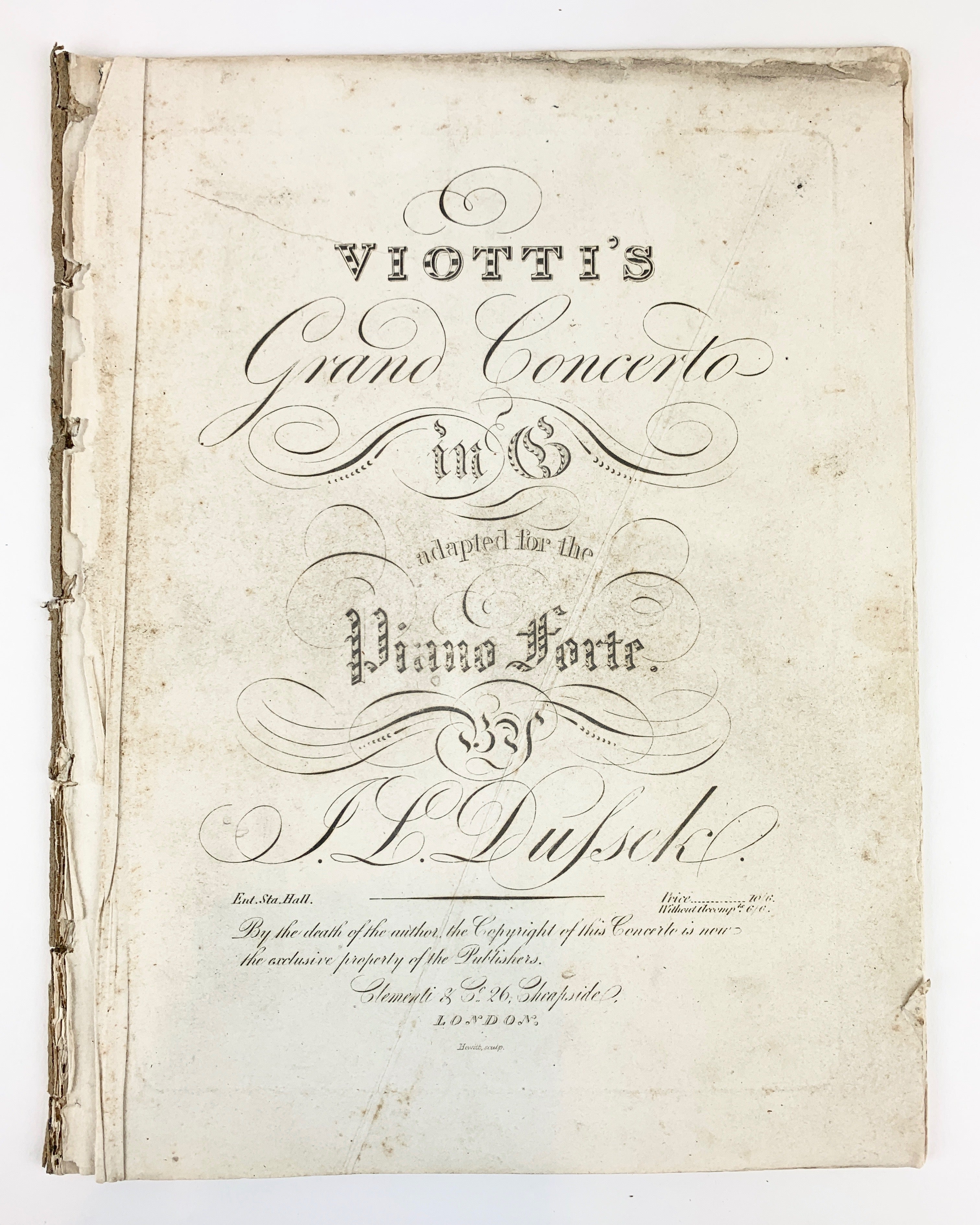 Viotti's Grand Concerto in G adapted for the Piano Forte. By J. L. Dussek. Clementi & Co., London. [No PN] Title, [vb]; [b]. 2-22. Engraved throughout. Together with single sheet Fluto Primo and Fluto Secondo parts. Disbound.