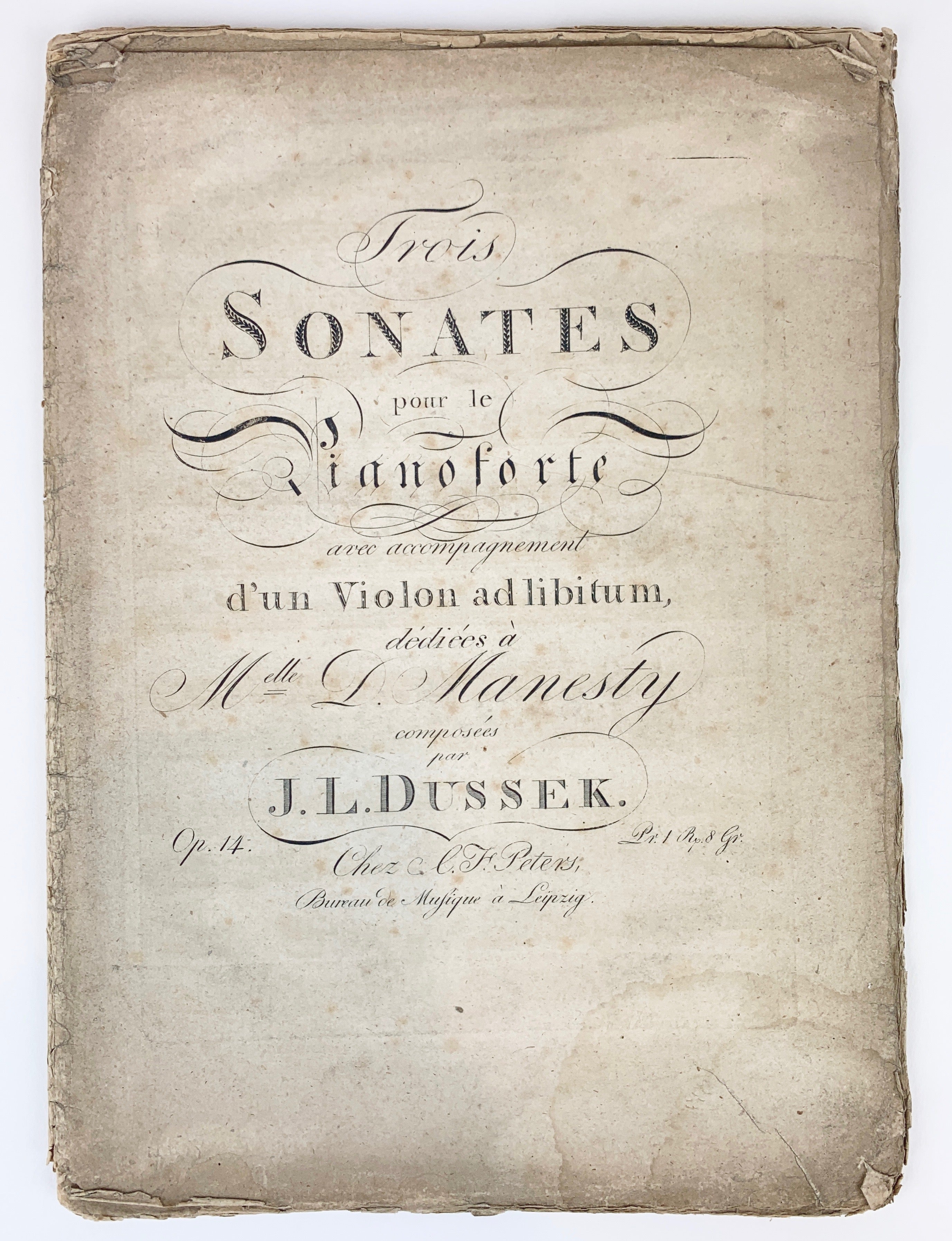 Trois sonates pour le pianoforte avec accompagnement d'un Violon ad libitum, dédiées à Melle D. Manesty composées par J. L. Dussek. Op. 14. Chez E. F. Peters, Leipzig. [PN 981] Title, 2-23. Engraved.