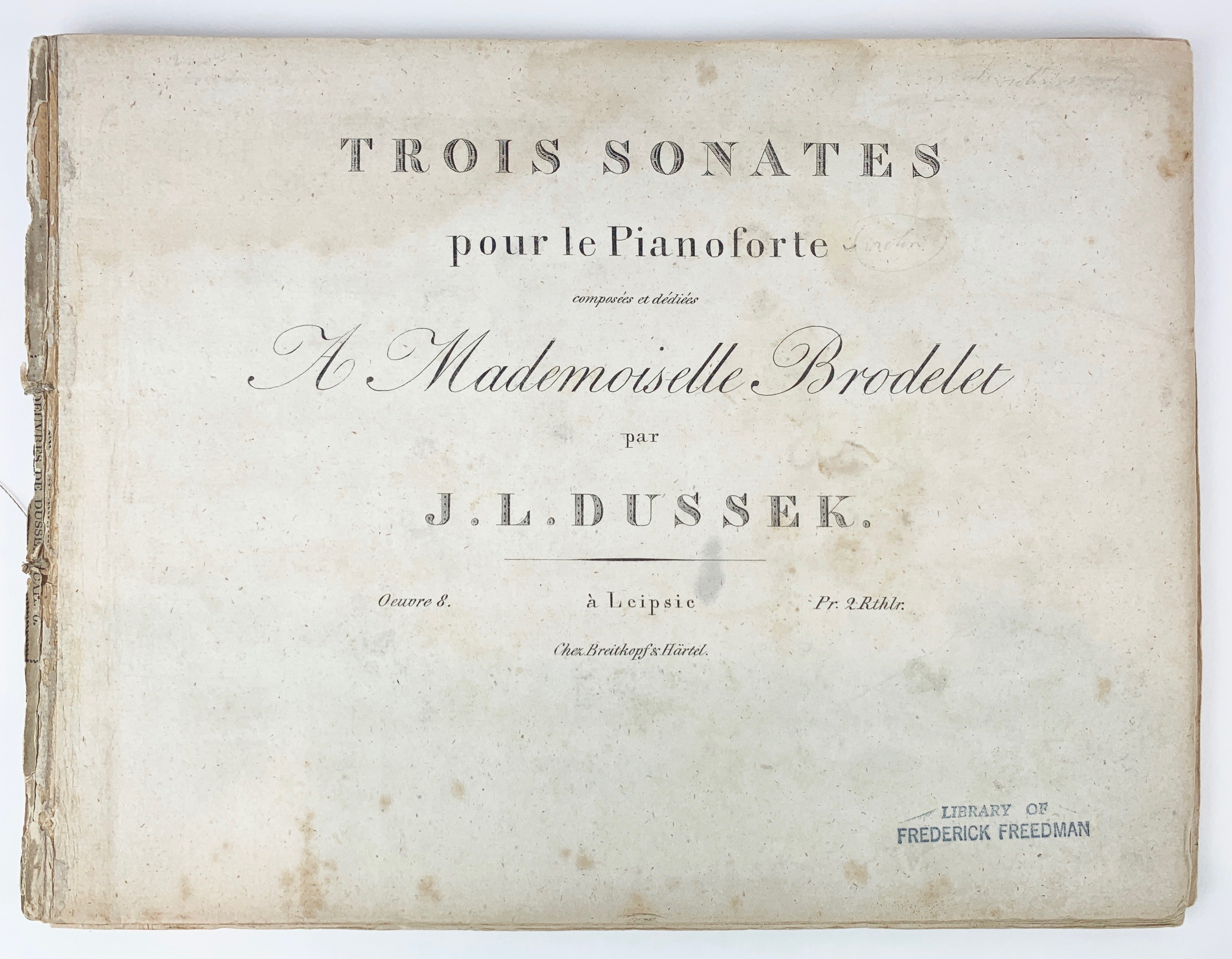 Trois sonates pour le Pianoforte composées et dédiées à Mademoiselle Brodelet par J. L. Dussek. Oeuvre 8. Chez Breitkopf & Härtel, Leipsic. [PN 2126] Title, [vb]; 3-47. Engraved throughout. "Library of Frederick Freedman" stamp to cover. Disbound.