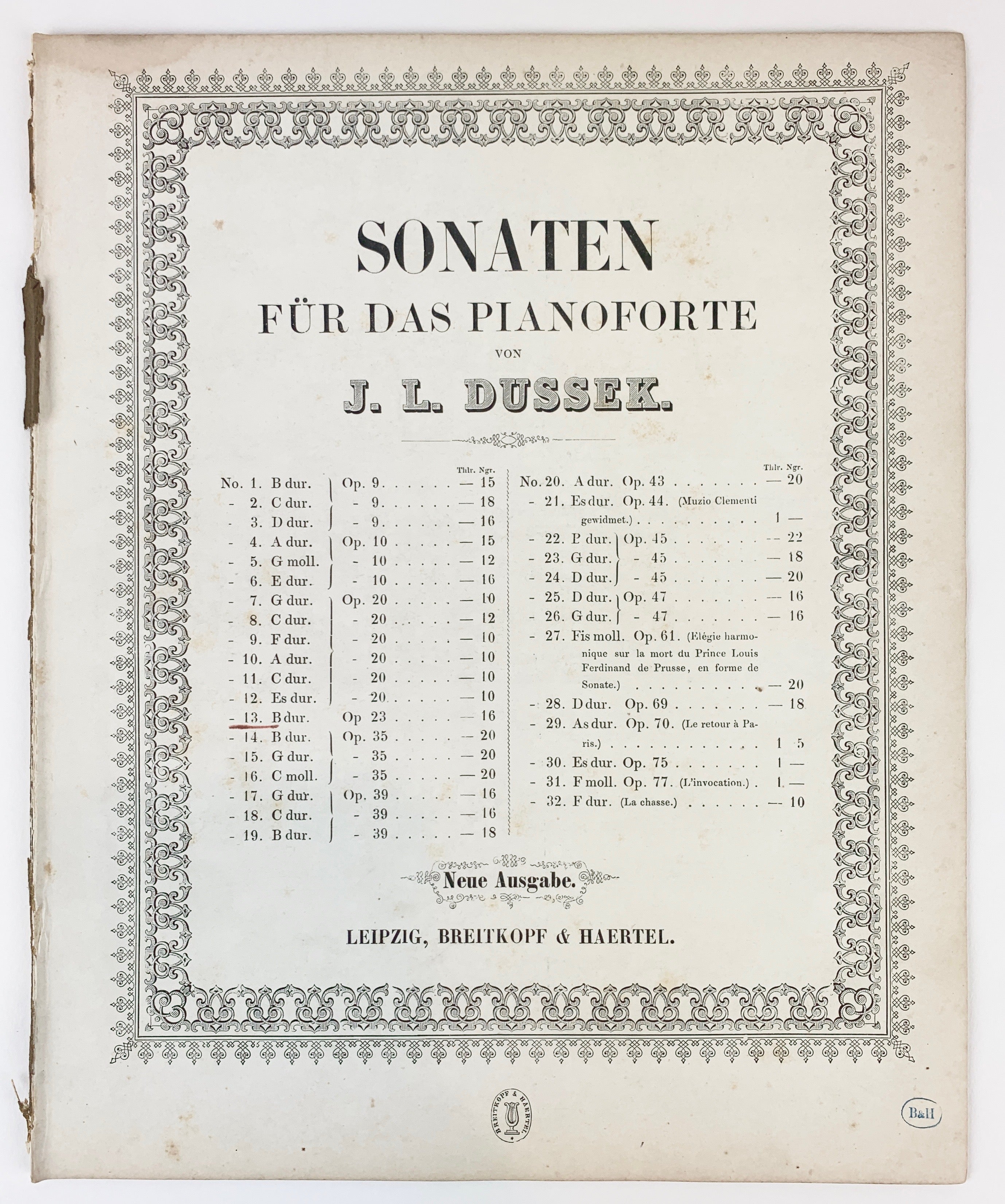 Sonaten für das Pianoforte von J. L. Dussek. Op. 23. Breitkopf & Haertel, Leipzig. [PN 9917] Title, [vb]; 3-15. Lithograph title page, else engraved. Pencil markings throughout, disbound.