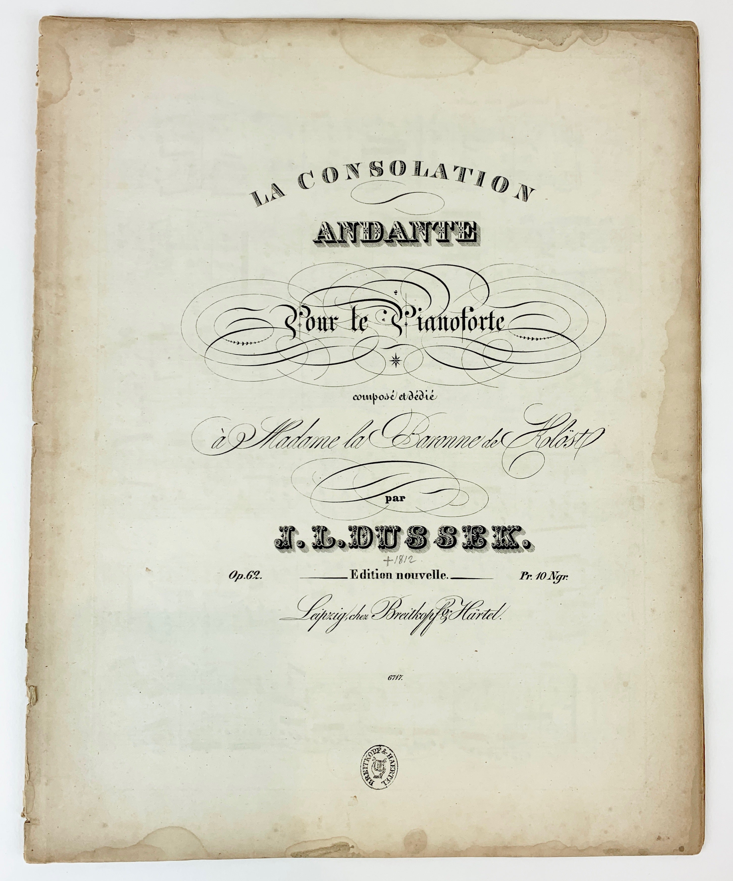 La Consolation Andante Pour le Pianoforte composé et dédié à Madame la Baronne de Kolöst par J. L. Dussek. Op.62. Breitkopf & Härtel, Leipzig. [PN 6717] Title, 2-9. Engraved throughout. Wrapper separated at spine.
