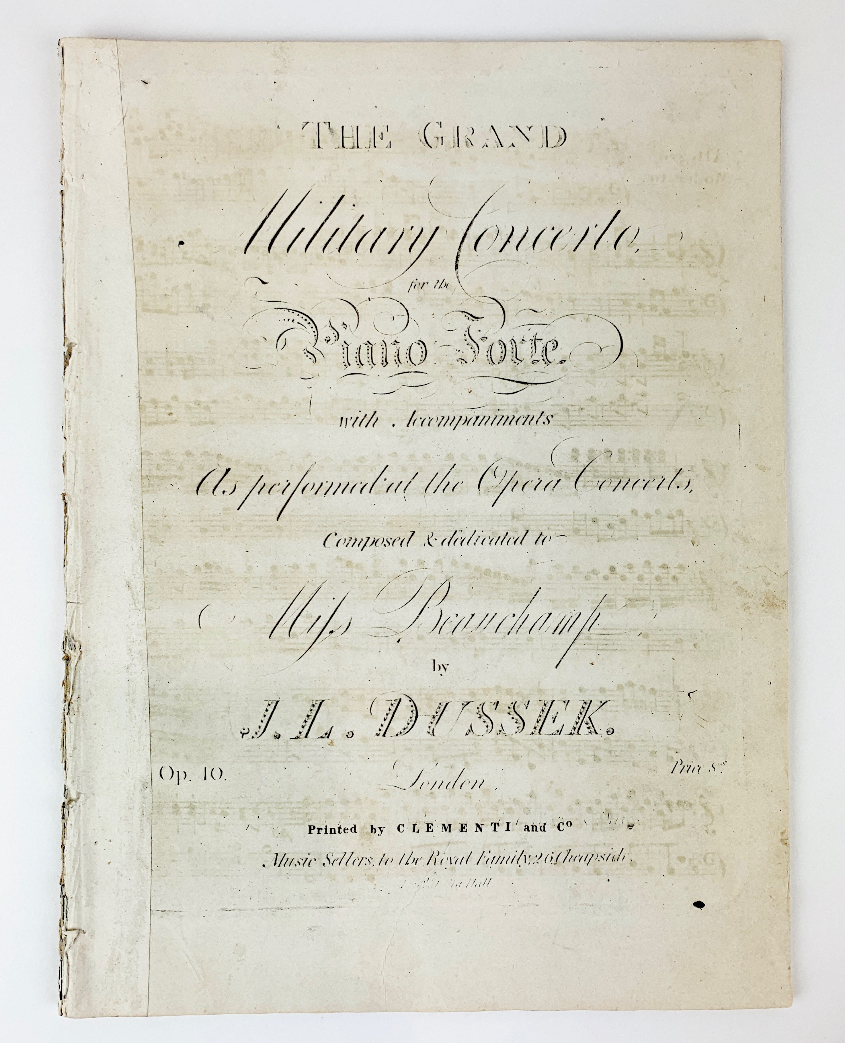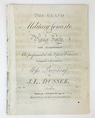 The Grand Military Concerto, for the Piano Forte, with Accompaniments As performed at the Opera Concerts, Composed & dedicated to Miss Beauchamp by J. L. Dussek. Op. 10. Clementi and Co., London. [No PN] Title, 2-28. Engraved throughout. Disbound.
