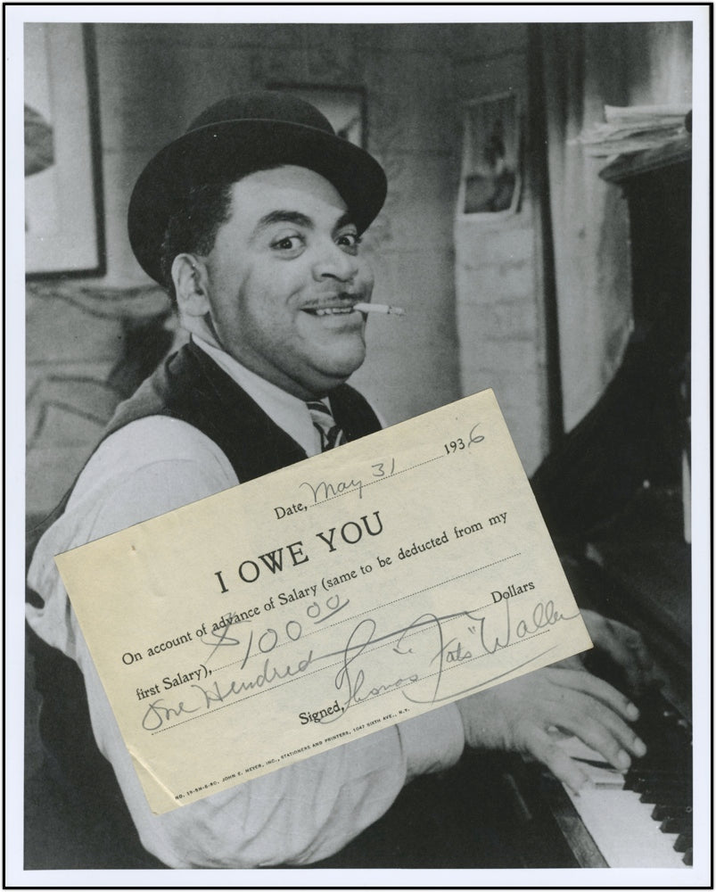 Waller, Thomas "Fats." (1904-1943). Signed Receipt. An uncommon 5.25 X 3.25 in. receipt, signed in full and dated May 30, 1936 by the great Fats, who acknowledges a debt of $100.00, "an advance to be deducted from my first salary." Sold together with a modern 8X10 photograph of Fats seats at the piano.