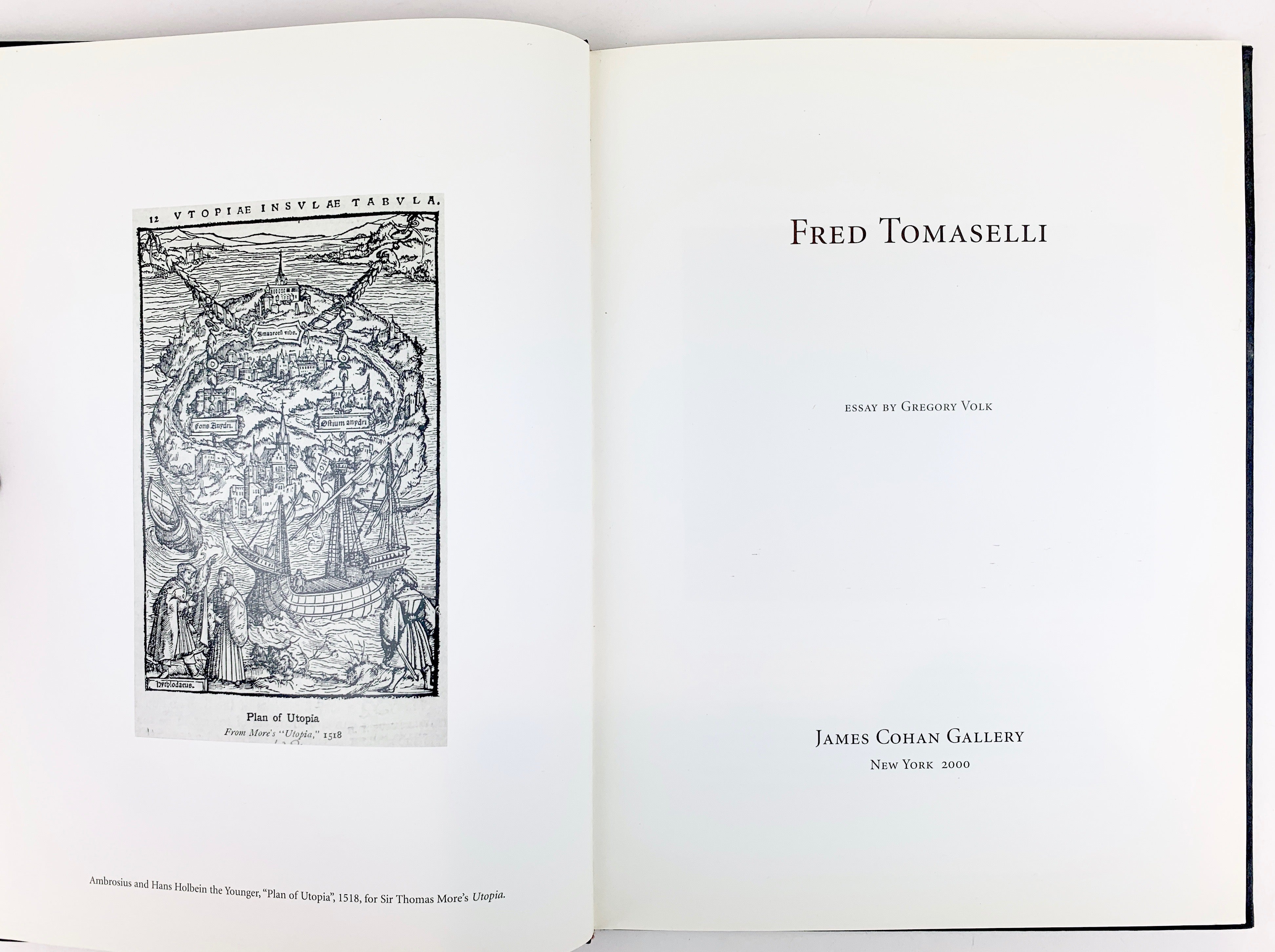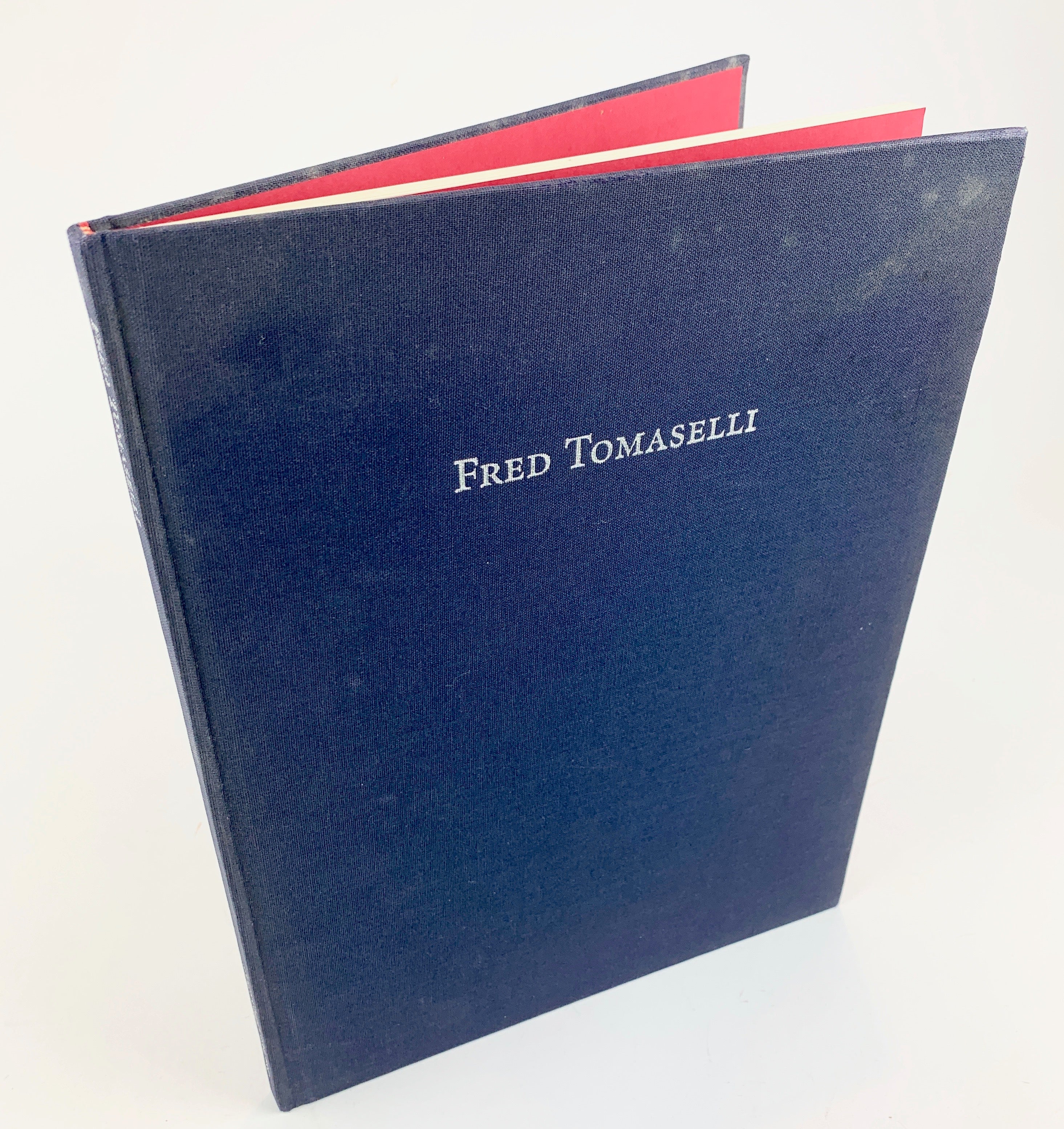 Tomaselli, Fred. (b. 1956). [Gregory Volk & Arthur Solway]. Fred Tomaselli - SIGNED. New York: James Cohan Gallery. 2000. First Edition; First Printing. Hardcover catalogue, signed to the half title in bold black ink "Fred Tomaselli / May 1, 2014." Dark blue cloth with gilt titles, as issued without dj. With numerous full page color plates and an essay by Gregory Volk, published on the occasion of the exhibition, December 2, 2000 - January 13, 2001. Boards a little stained, otherwise a tight, clean and crisp copy. 12.28 x 9.28 x 0.45 inches. 50pp.
