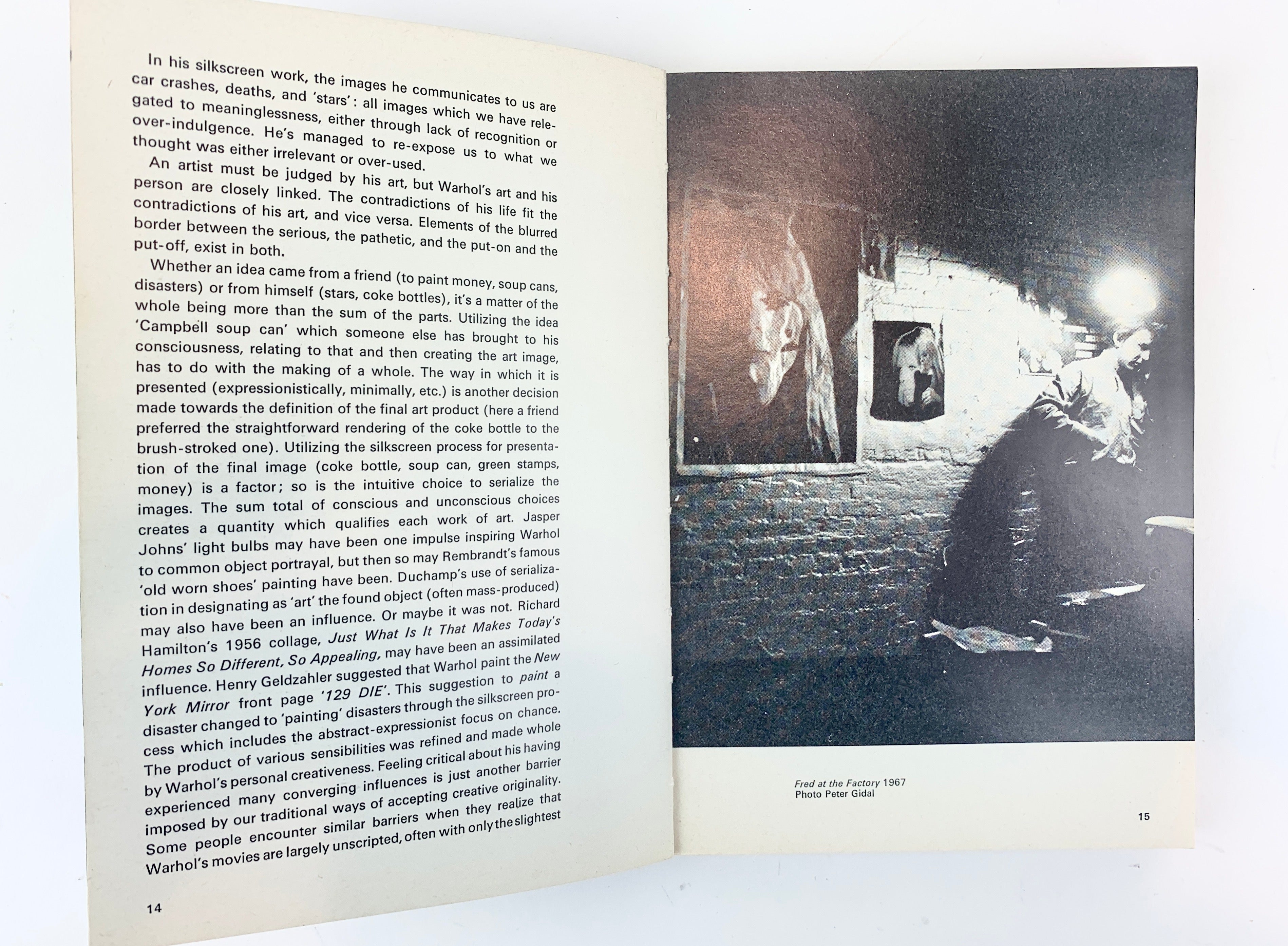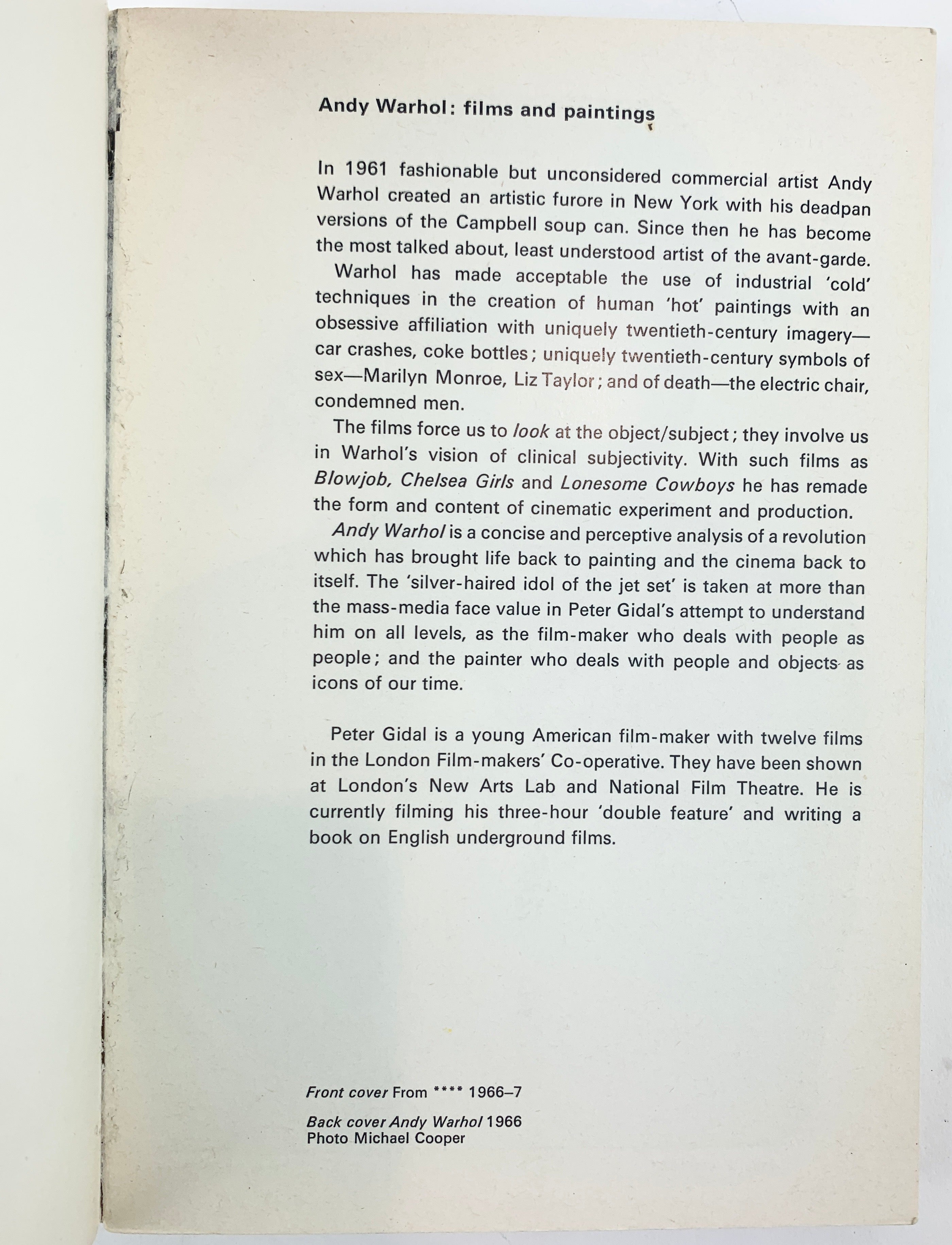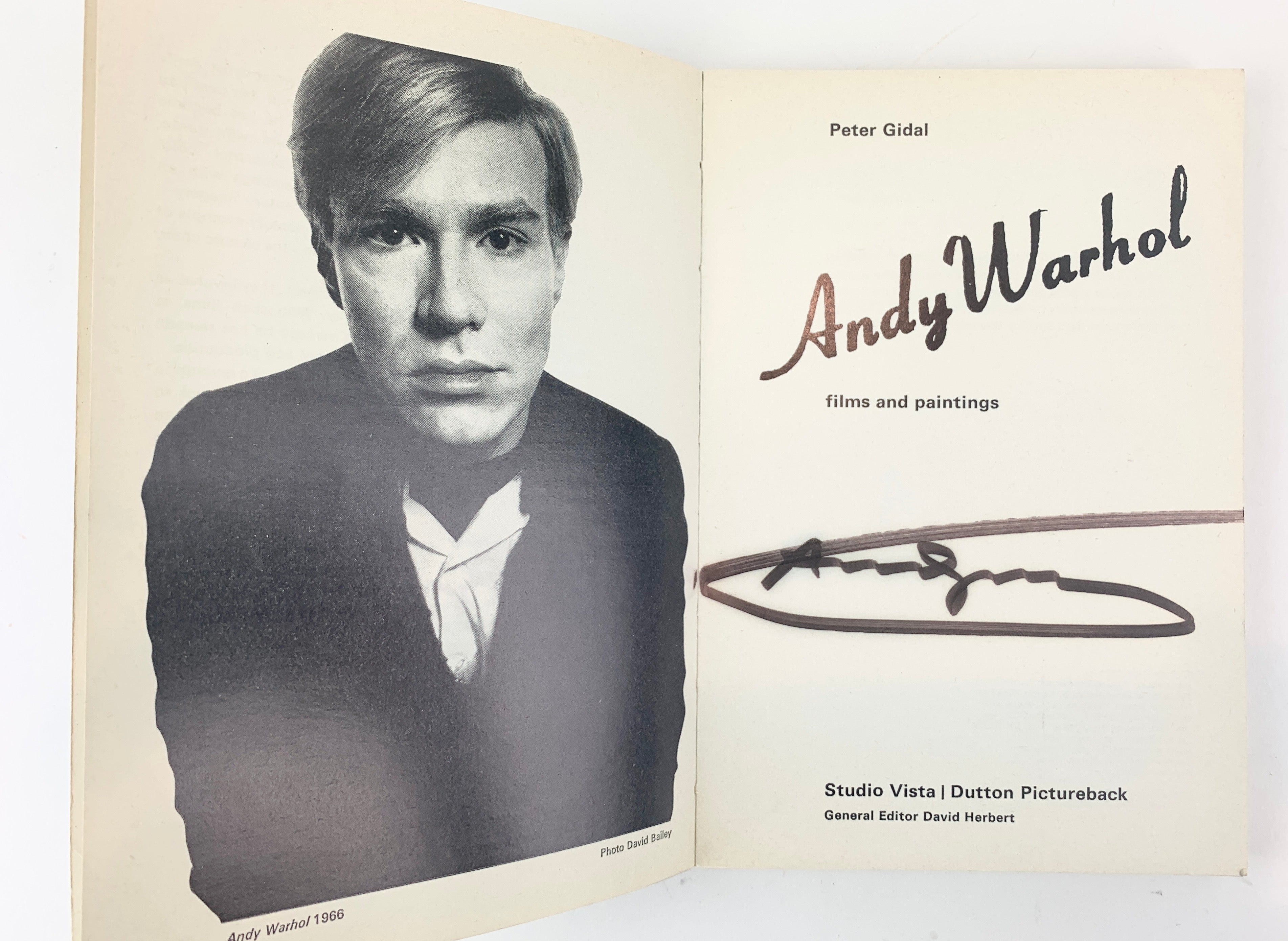 Warhol, Andy. (1928–1987) [Gidal, Peter.]. Andy Warhol, Films and Paintings - SIGNED . London: Studio Vista Ltd.. 1971. First paperback edition. Small 8vo. 160 pp. Signed "Andy Warhol" in bold black ink to the titlepage. A few thin scratches and creases to wrapper laminate, otherwise about fine.