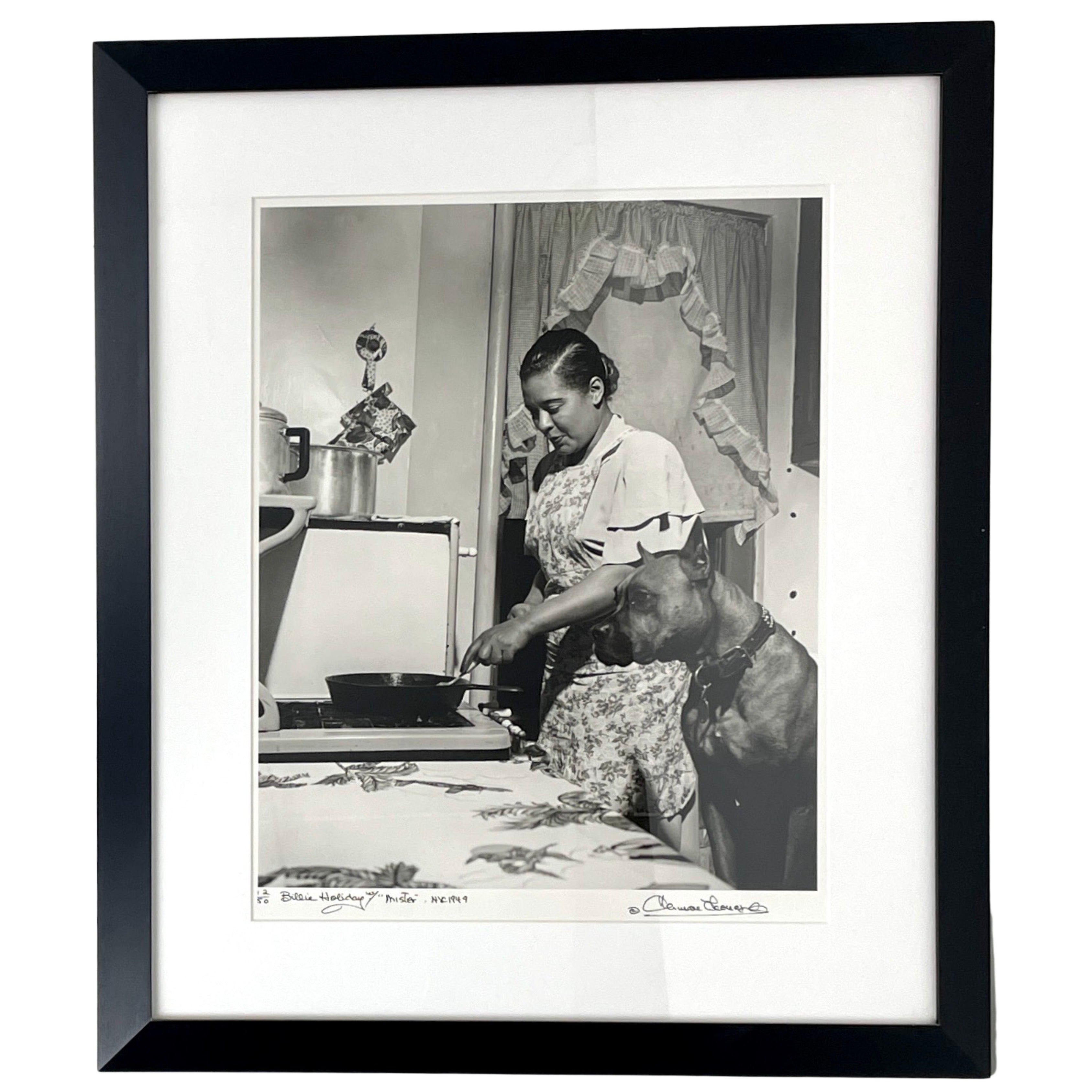 Original photograph by the American photographer known for his unique images of jazz icons, who has captured the trailblazing and influential vocalist in the kitchen with her beloved dog, Mister, ca. 1949. Gelatin silver print, printed later. Signed titled, dated and editioned 12/50 in ink, lower margin recto. Overall very good condition. Extremely faint hairline scratches visible under raking light. A very few small dots and dashes of fine retouching in the upper half of the work. Sight 14 x 17.4 inches (35.6 x 44.1 cm.)Window matted and framed under glass to 26.5 by 22.5 inches. Not examined out of frame.