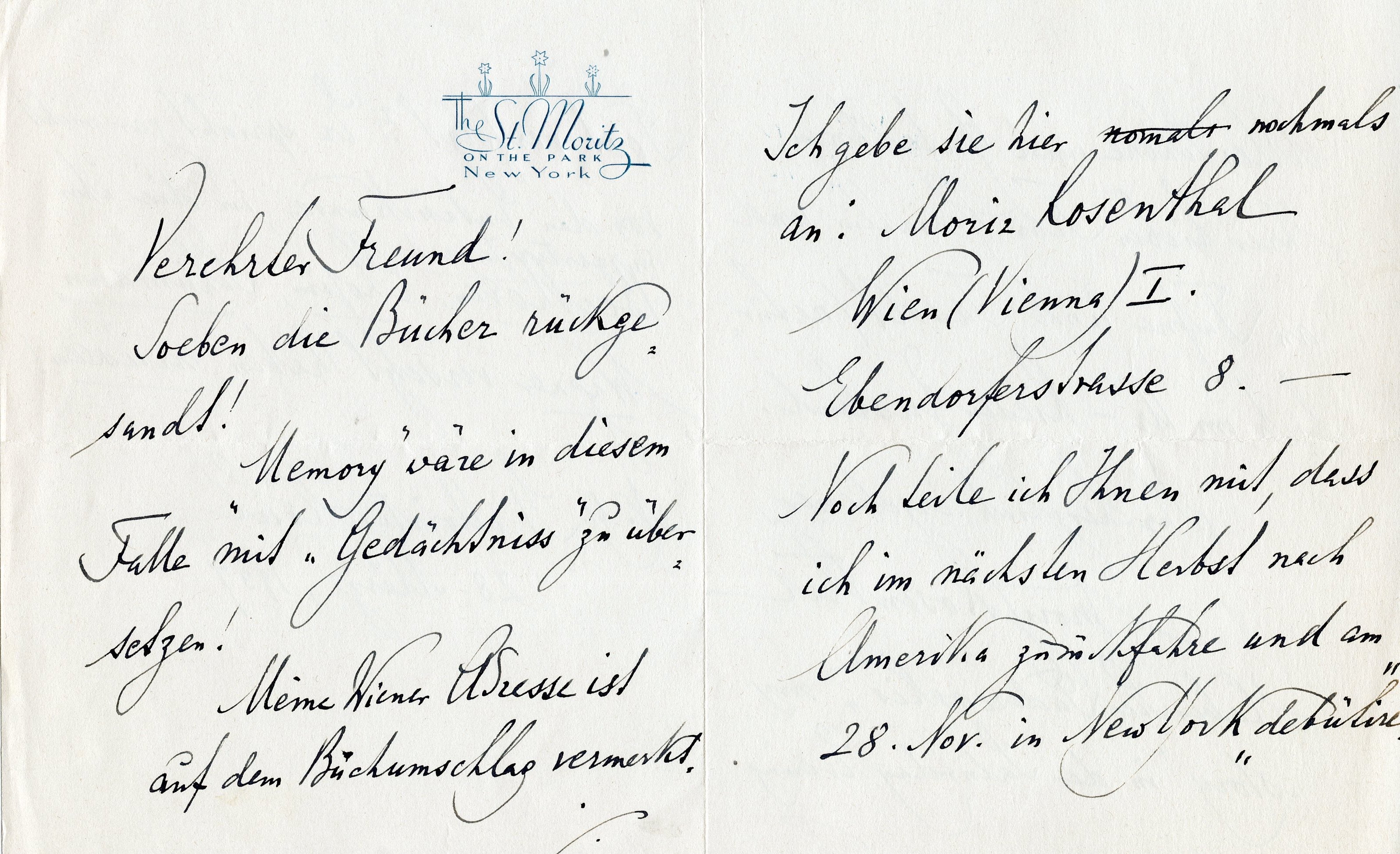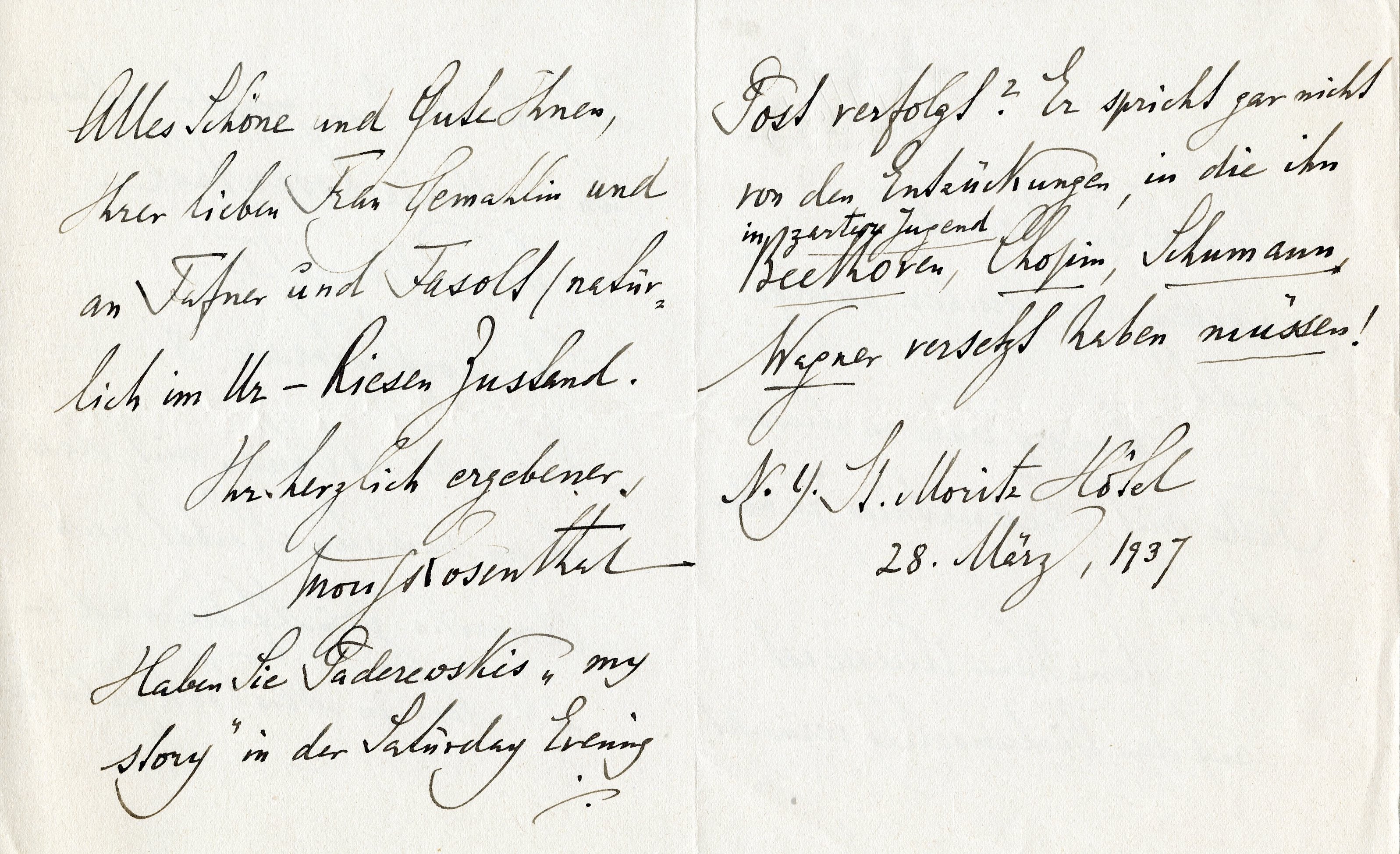 2. To the same (follow-up to the above letter). New York, St. Moritz Hotel, March 28, 1937. 4 pp. Bifolium with letterhead of St. Moritz on the Park hotel, New York. "Dear friend, I just returned the books. ... My Viennese address is noted on the envelope of the books. I give it here once more: Moriz Rosenthal | Wien (Vienna) I. | Ebendorferstrasse 8. – I also want to tell you that I will go back to America next fall and will have my first New York concert on November 28. All the best to you, your wife and to Fafner and Fasolt (of course, in their original state as giants). Yours very truly, Moriz Rosenthal. [P.S. Have you followed Paderewski's 'My Story' in the Saturday Evening Post? He does not even mention the delights he must have experienced thanks to Beethoven, Chopin, Schumann, and Wagner wen he was very young." Fafner and Fasolt are the two giants in Richard Wagner's Ring. Fafner kills Fasolt and subsequently morphes into a dragon. Ignacy Jan Paderewski (1860-1941) published "My Story" as a serial in the weekly Saturday Evening Post.