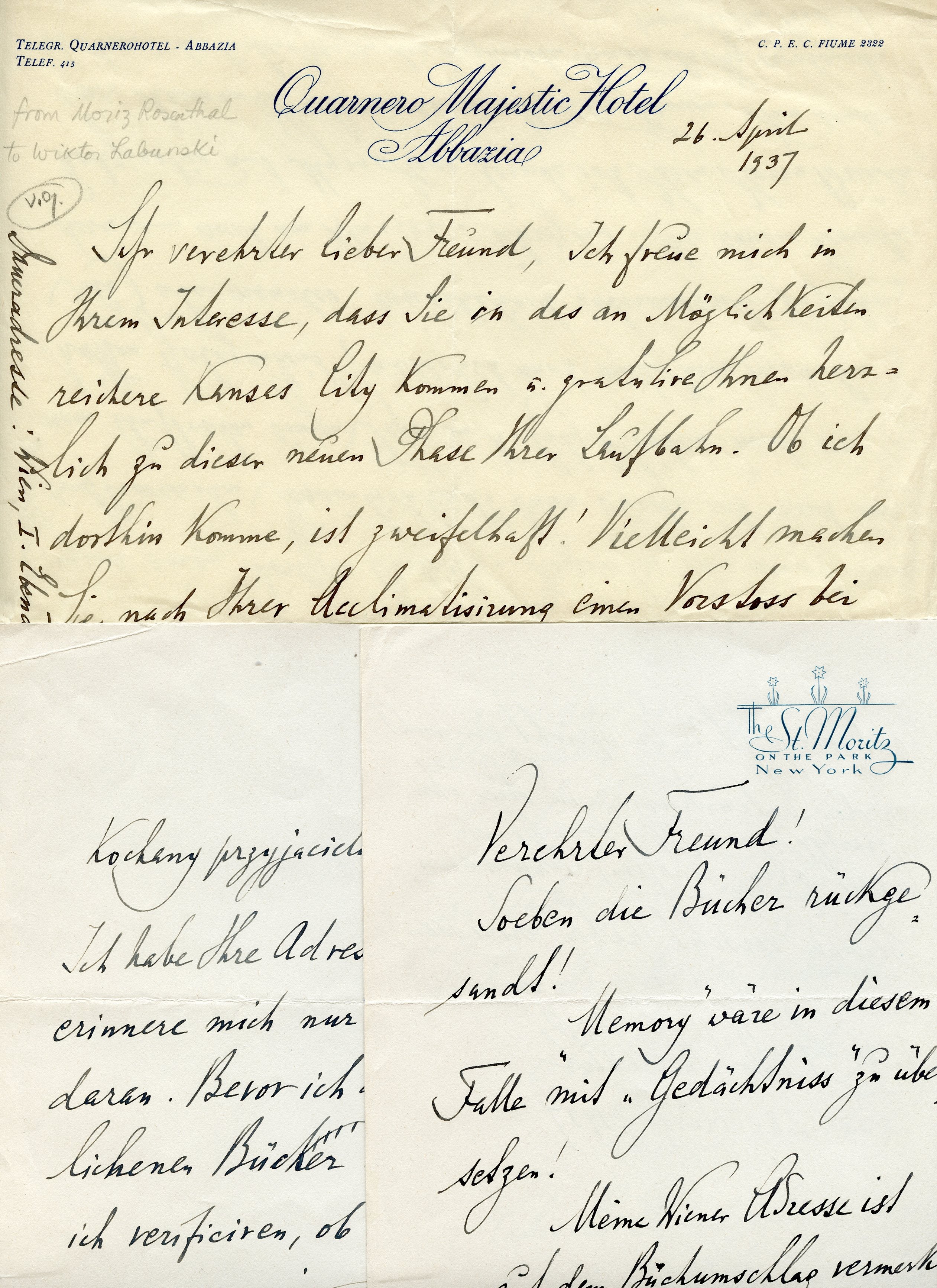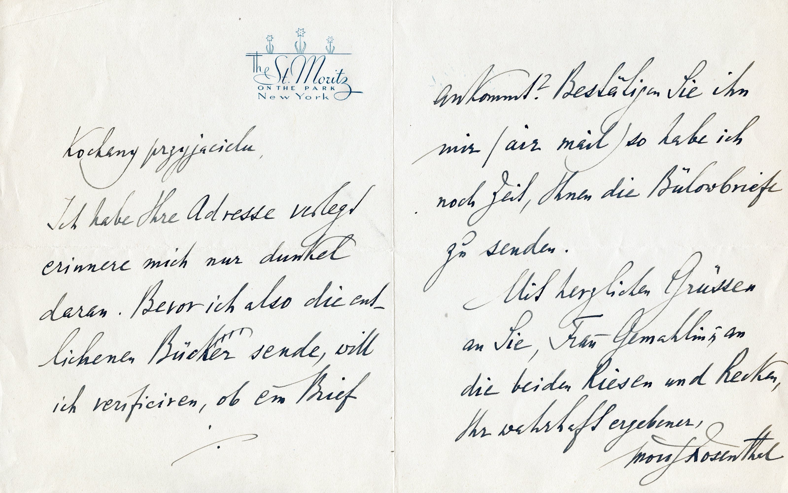 1. To unidentified male recipient (Wiktor Łabuński?). No date. 2 pp. Bifolium with letterhead of St. Moritz on the Park hotel, New York. In full: "Kochany przyjacielu [Polish, 'Dear friend'], I cannot find the address and remember it only vaguely, Thus, before I send you the borrowed books, I want to verify whether the letter will arrive. Please confirm by air mail so that I still have the time to sent you Hans von Bülow's letters. With cordial regards to you, your wife and the two giants, Yours very Truly Moriz Rosenthal." 6.75 x 5.25 inches (17 x 13.5 cm). The "two giants" are the recipient's sons.