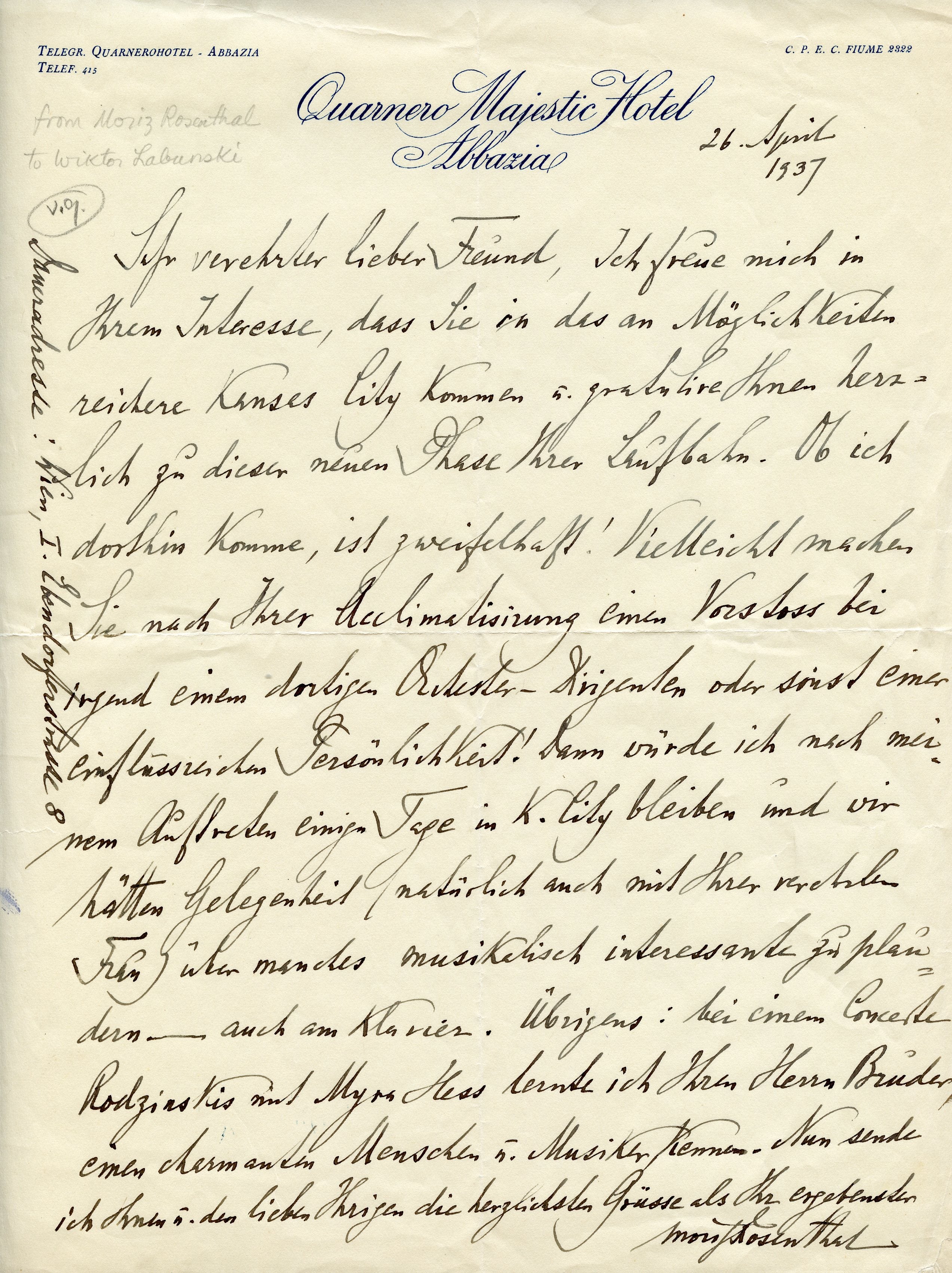 3. To Wiktor Łabuński (not named, but context is clear). Abbazia, Italy (now Opatija, Croatia), April 26, 1937. 1 p. Stationery of Quarnero Majestic Hotel (now Hotel Kvarner). In full: "Dear esteemed friend, I am delighted for you that you will come to Kansas City, which offers more opportunities, and I cordially congratulate you on this new stage of your career. It is doubtful whether I will make it there! Maybe you will approach an orchestral conductor there or some other influential person once you have settled in! In that case, I would stay in Kansas City for a few days after the performance, and we would have the opportunity to discuss many an interesting musical topic with you—also at the piano, and of course also with your wife. By the way: In a concert by [Artur] Rodzinski with Myra Hess I met your brother, a charming person and musician. Now I send you and your dear ones my most cordial regards s Yours truly Moriz Rosenthal." Fold partly split, right bottom corner torn. 11.5 x 8.75 inches (29 x 22.5 cm).