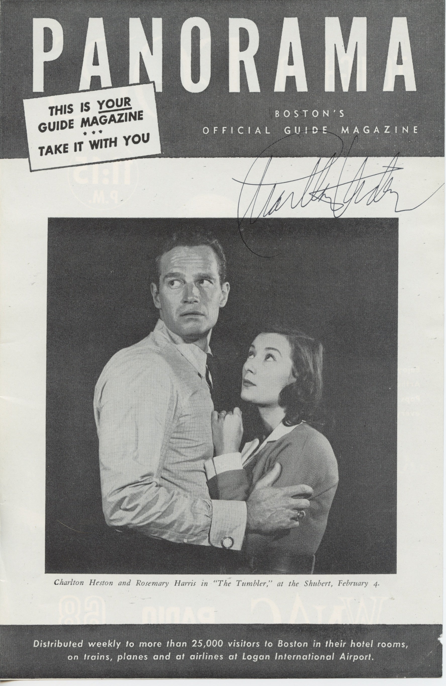 Signed single sheet removed from Panorama: Boston's Official Guide Magazine (unpaginated; no date) with a photograph depicting a stage scene and the printed caption, "Charlton Heston and Rosemary Harris in The Tumbler, at the Shubert, February 4." Signed by Heston only. 6 x 9 inches (15 x 23 cm). In good condition.