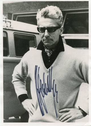 Signed half-length photograph of the Austrian conductor apparently standing in a parking lot (runway?) and wearing a V-neck sweater and sunglasses. 7 x 5 inches (18 x 13 cm). In good condition.