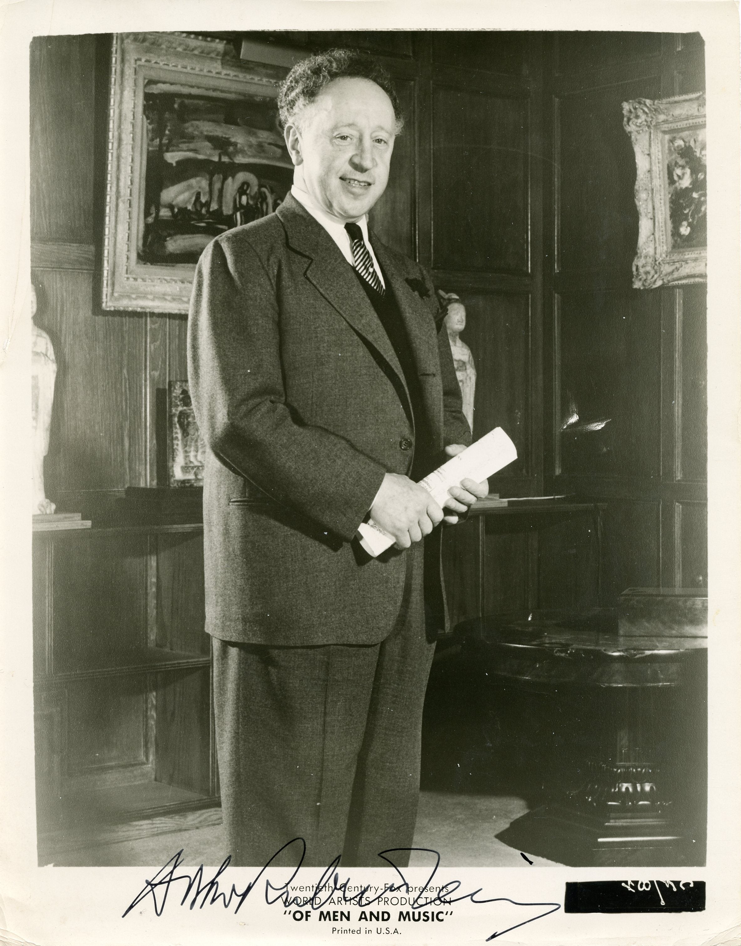Rubinstein, Arthur. (1887–1982). Signed photograph. Signed glossy knee-length portrait of the Polish-born pianist; promotional still from the 20th Century Fox documentary Of Men and Music (1951). 10.25 x 8 inches (25.7 x 20.1 cm). Crease to top left corner and slight wear to other corners, else in fine condition.