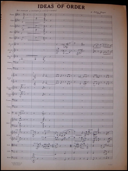 Berger, Arthur. (1912-2003). Ideas of Order. Boston: 1952. First edition. Vintage oversize dyeline full orchestral score, 13 x 17 inches. 66 pp. Dedicated to Dimitri Mitropoulos.