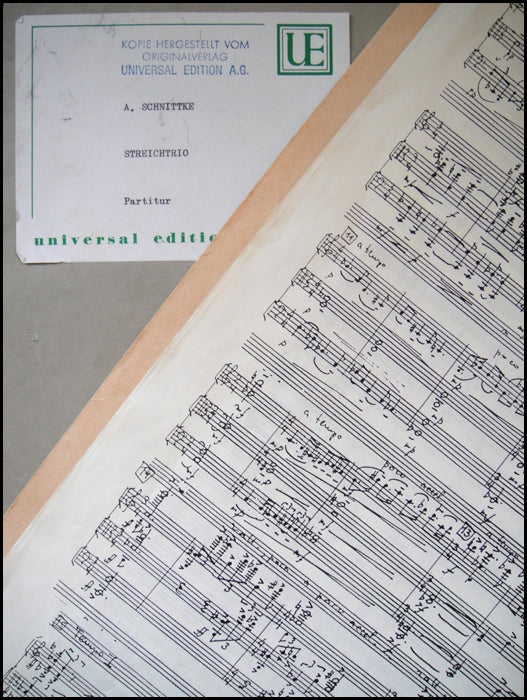 Schnittke, Alfred. (1934-1998). Streichtrio fur Violine, Bratsche und Violoncello.. Vienna: Universal Edition. 1985. First edition. Full score in large folio. 13 pp. in original grey wrappers. Together with an additional copy, both facsimile manuscript scores.