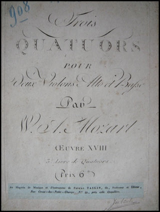 Mozart, Wolfgang Amadeus. (1756–1791). Trois Quatuors...Oeuvre XVIII, 3e Livre de Quatuors. ["Prussian" String Quartets: K. 575, 589, 590]. Paris: Imbault. c. 1792. Folio. 20+19+17+15 pp. Engraved. [PN] 345. With the notice of Pascal Taskin laid over the Imbault impression on the Violon I folio. Blue pencil notation on the title pages, usual foxing. A very fine and early copy of these late quartets. Gribenski 21.51.